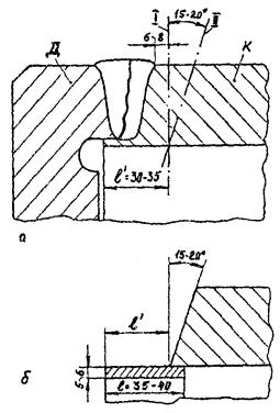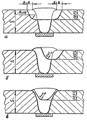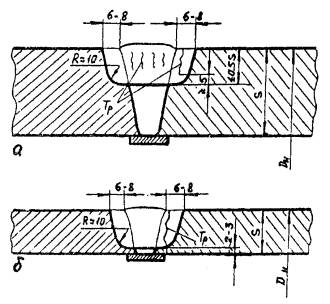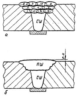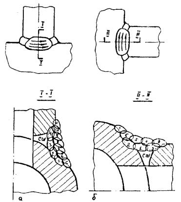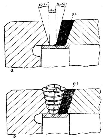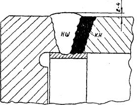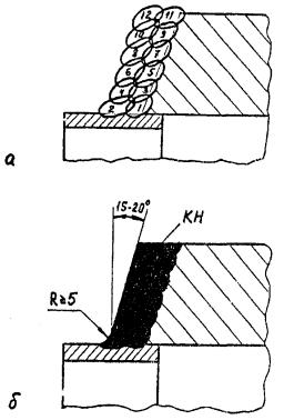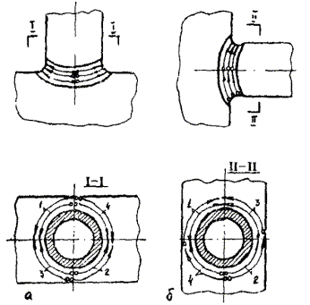 Рис. 13.12. Последовательность выполнения наплавки аустенитными электродами на вертикальный (а) и горизонтальный (б) штуцеры Рис. 13.13. Подготовка поверхности коллектора под сварку углового шва аустенитными электродами: а - поверхность, подготовленная под наплавку; б - расположение валиков наплавки (на примере однослойной наплавки); в - поверхность наплавки после механической обработки: для штуцеров Æ 133´17 мм: l = 17 - 18 мм, h = 12 - 14 мм; для штуцеров Æ 108´10(11) мм: l = 10 - 11 мм, h = 6 - 7 мм 13.7.3. Собранный под сварку штуцер должен иметь кольцевой зазор в корневой части, равный 2 - 3 мм для штуцера без подкладного кольца и 4 - 6 мм - для штуцера с подкладным кольцом (рис. 13.14) Соединяемые детали скрепляются двумя прихватками длиной по 40 - 50 мм и высотой 4 - 6 мм в корневой части шва. Прихватки следует располагать в диаметрально противоположных местах. Для прихватки используются электроды Э-11Х15Н25М6АГ2 диаметром 3 мм; сварка выполняется током 80 - 90 А без подогрева. Рис. 13.14. Собранный под сварку стык без подкладного кольца (а) и с подкладным кольцом (б) 13.7.4. Угловой шов выполняется многослойным способом кольцевыми валиками шириной 12 - 16 мм, высотой 4 - 6 мм. Режимы сварки постоянным током обратной полярности следующие: сила тока 80 - 90 и 110 - 120 А при сварке электродами - Э-11Х15Н25М6АГ2 диаметром 3 и 4 мм соответственно (табл. 13.3). Примерная последовательность сварки кольцевых валиков и размеры катетов углового шва штуцера показаны на рис. 13.15. Сварку углового шва следует проводить без подогрева свариваемых деталей. Максимальная допустимая температура самонагрева деталей при сварке составляет 100 °С (на расстоянии 20 мм от края свариваемого шва). Послесварочный термический отдых не проводят. Рис. 13.15. Примерная последовательное сварки кольцевых валиков и размеры катетов углового шва штуцера DУ-100. Сварка и наплавка выполнены аустеиитными электродами 13.7.5. Наружная поверхность углового шва должна быть обработана механическим способом абразивным инструментом (шлифованием) до получения плавного сопряжения поверхности шва с усиливающей наплавкой и основным металлом штуцера и коллектора (рис. 13.16). 13.7.6. Сварное соединение подвергают радиографическому контролю и макроанализу поверхности шва и наплавок; их качество оценивается по нормативным требованиям РД 34 15.027-93 для сварных соединений перлитных сталей. Рис. 13.16. Форма углового шва с наплавками после механической обработки (шлифования). Угловой шов и наплавки выполнены аустенитными электродами 14. КОНТРОЛЬ КАЧЕСТВА СВАРНЫХ СОЕДИНЕНИЙ14.1. При проведении ремонта применяют следующие методы контроля. 14.1.1. Визуальный и измерительный контроль - для выявления недопустимых макродефектов и несоответствия геометрических параметров соединений. Визуальный контроль проводят после травления 15 % водным раствором азотной кислоты поверхности перлитного металла (12Х1МФ, 15Х1М1Ф, 20ХМФЛ, 15Х1М1ФЛ, 09Х1МФ, 09Х1М) и травления аустенитного металла в соответствии с требованиями ОСТ 34-70-690-84. 14.1.2. Магнитопорошковая дефектоскопия (МПД). Контроль проводят вместо визуального анализа для выявления недопустимых макродефектов и выполняют в соответствии с ГОСТ 211.05 и ОСТ 108.004.109-80. 14.1.3. Стилоскопирование. Спектральный анализ предназначен для подтверждения требуемого содержания легирующих элементов в металле швов и наплавок. Контроль проводят в соответствии с РД 34 10.122