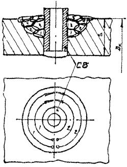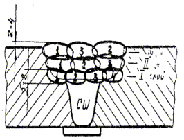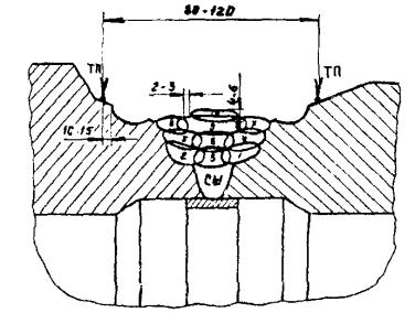 Примечание. S - толщина стенки коллектора (камеры). механическим способом (фрезерованием, сверлением) удаляется временная стальная втулка СВ и механическим способом (шлифованием) снимается выпуклость (усиление) подварочного шва ПШ заподлицо с поверхностью коллектора (рис. 12.1,в); проводится контроль качества подварочного шва; приваривается угловым швом новый штуцер к коллектору согласно рекомендациям РД 34.15.027-93. Электроды Э-09Х1М применяются для углового шва при подварочном шве 09Х1МФ и электроды Э-11Х15Н25М6АГ2 при любом типе подварочного шва. 12.4.2. При выборке поврежденного металла рекомендуется применять V-образную разделку поперечного сечения выборки, а перед сваркой поверхность выборки и прилегающий участок металла с наружной стороны шириной 10 - 20 мм очищать до металлического блеска. 12.4.3. Наплавку подваренного шва (ПШ) выполняют по одному из вариантов: по основному варианту - электродами Э-09Х1МФ с подогревом при глубине выборки до 50 % толщины стенки коллектора и по резервному варианту - аустенитными электродами Э-11Х15Н25М6АГ2 без подогрева при глубине выборки не более 10 мм (табл. 12.1). Сварку выполняют многослойным способом валиками толщиной 5 - 8 мм (рис. 12.2), при этом режимы тока с использованием электродов Э-09Х1МФ диаметром 2,5 и 3 мм составляют 75 - 90 и 90 - 110 А соответственно. При использовании аустенитных электродов Э-11Х15Н25М6АГ2 режимы тока должны быть на 10 - 15 % ниже по сравнению с указанными. Рис. 12.2. Рекомендуемые формы, выборки и последовательность наплавки валиков подварочного шва при ремонте поврежденного металла с межочковой трещиной: СВ - стальная втулка 12.4.4. Стальную втулку СВ применяют как вспомогательное приспособление для облегчения более качественного выполнения многослойного подварочного шва (рис. 12.1 и 12.2). Толщина втулки - 5 - 6 мм, материал - сталь 20 или 12X1МФ. Установка втулки в отверстие под штуцер должна быть плотной без проскальзывания и падения ее во внутреннюю полость коллектора (камеры). 12.4.5. Термическую обработку по режиму высокого отпуска при ремонте по основному варианту электродами Э-09Х1МФ (табл. 12.1) допускается проводить любым способом нагрева: индукционным, электропечами сопротивления и газопламенным. Технологию нагрева и регистрацию температур выполняют в соответствии с требованиями РД 34 15.027-93. Ширина равномерного кольцевого участка нагрева коллектора (камеры) включает ширину подварочного шва (размер берется вдоль оси коллектора) и дополнительно по 50 - 100 мм ширины примыкающих кольцевых участков коллектора с каждой стороны подварочного шва. 12.5. Технология ремонта мест, пораженных поперечными трещинами в угловых швах. 12.5.1. Последовательность технологических операций та же, что в п. 12.4.1 настоящего РД. При наличии коротких поперечных трещин длиной до 10 - 15 мм удалению подлежит штуцер, угловой шов которого поражен поперечными трещинами, удаляют также соседние штуцера, к угловым швам которых подходят вершины трещин. 12.5.2. Форма выборки поврежденного металла должна быть кольцевой; способ заполнения - многослойный кольцевыми валиками толщиной 5 - 8 мм (рис. 12.3); сила тока - 75 - 90 А и 90 - 120 А при сварке электродами Э-09Х1МФ диаметром 2,5 и 3 мм соответственно, при использовании аустенитных электродов Э-11Х15Н25М6АГ2 режимы тока на 10 - 15 % ниже указанных. Рис. 12.3. Рекомендуемая последовательность наплавки кольцевых валиков подварен