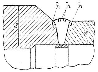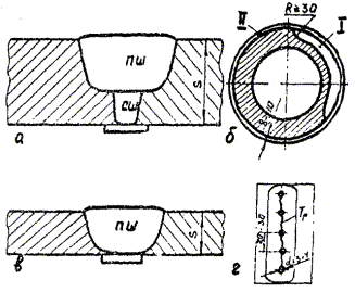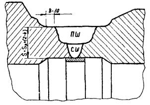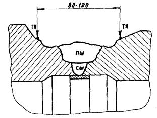Примечания. 1. Термическая обработка проводится сразу после окончания сварки подварочного шва, не допуская охлаждения ниже температуры подогрева (табл. 9.2). 2. Скорость нагрева до 600 °С должна быть не более 50 °С/ч и свыше 600 °С - не менее 100 °С/ч. 3. Скорость охлаждения с температур отпуска до 300 °С должна быть не более 100 °С/ч. 4. Термическая обработка проводится индукционным и электропечным способами: газопламенный способ нагрева не допускается. 5. Термопары для регистрации температур должны быть расположены равномерно по периметру отремонтированного стыка в четырех местах и с каждой стороны сварного шва (общее количество - 8 термопар); рис. 9.5. 6. Ширина кольцевой зоны равномерного нагрева при высоком отпуске составляет 150 - 200 мм со сварным швом в центре. 9.2.5. После проведения высокого отпуска наружная поверхность подварочного шва и прилегающих участков основного металла по всему периметру должна быть обработана механическим способом до получения требуемой формы (рис. 9.6). Толщина сварного шва с подваркой должна на 2 - 4 мм быть больше расчетной (номинальной) толщины стенки трубных элементов в районе расточки под подкладное кольцо, т.е. S = Sp +(2-4), как на рис. 9.6. Рис. 9.6. Наружная поверхность отремонтированного сварного соединения после механической обработки. Соединение подготовлено для проведения контроля неразрушающими методами: СШ - старый шов; ПШ - подварочный шов 9.3. Качество отремонтированных сварных соединений фасонных частей между собой оценивают по результатам неразрушающих методов контроля: МПД или визуального контроля поверхности, травленной 15 % водным раствором азотной кислоты. Контролю подлежит поверхность подварочного шва и прилегающих кольцевых участков основного металла шириной 20-30 мм с каждой стороны шва по всему периметру; УЗК на поперечные трещины, проводимого в соответствии с требованиями ОП № 501 ЦД-75; допускается замена УЗК на метод радиографии по всему периметру сварного шва; металлографического анализа с помощью реплик, снимаемых с ЗТВрп на расстоянии 2 - 4 мм от края (зоны сплавления) сварного шва на основном металле в четырех местах по периметру стыка и с обеих сторон подваренного шва (общее количество - 8 реплик). Службой металлов и сварки ТЭС может быть дополнительно назначен контроль поверхности подварочного шва; измерения твердости поверхности подварочного шва в 3 - 4 местах, равномерно расположенных по периметру стыка; спектрального анализа поверхности подварочного шва в 3 - 4 местах, равномерно расположенных по периметру стыка. Результаты контроля считают положительными при следующих условиях: качество поверхности подварочного шва, оцененное по МПД или визуальному контролю, соответствует требованиям РД 34 15.027-93 (для макроанализа); качество сварного шва, оцененное УЗК или методом радиографии, соответствует требованиям РД 34 15.027-93; микроповрежденность ЗТВрп не превышает требований п. 9.1. Аналогичные требования распространяются и при оценке микроповрежденности металла шва; твердость сварного шва и химический состав по результатам спектрального анализа соответствуют требованиям РД 34 15.027-93. 10. ТЕХНОЛОГИЯ РЕМОНТА ПОВРЕЖДЕННЫХ УЧАСТКОВ ПАРОПРОВОДНЫХ ТРУБ10.1. Ремонт поврежденных участков труб (приложение 1) проводится при соблюдении следующих условий: глубина выборки дефектного (поврежденного) металла не пр