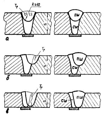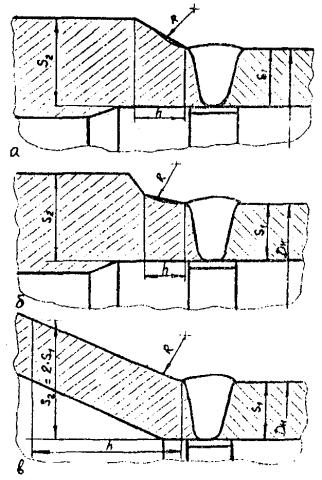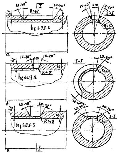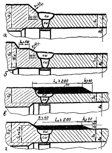 Примечание. Применяется любой способ нагрева: индукционный, электропечной и газопламенный. 8.2.4. Сварное соединение с подваренным швом подвергают термической обработке по режиму 720 - 750 °С с выдержкой 1 - 3 ч в зависимости от высоты подварочного шва, принимаемого за толщину стенки трубного элемента, выбираемую для установления длительности выдержки согласно РД 34 15.027-93. Применяется индукционный или электропечной способы нагрева; контроль температур и технология нагрева проводятся согласно требованиям РД 34 15.027-93. Рис. 8.3. Рекомендуемая схема многослойного заполнения места выборки ремонтируемого стыкового сварного соединения разнотолщинных трубных элементов паропровода 8.2.5. После термической обработки поверхности подварочного шва и прилегающих участков основного металла должны быть обработаны механическим способом. Конструкции сварных соединений улучшенного типа с подварочным швом представлены на рис. 8.4. 8.3. Технология улучшения формы сварных соединений. 8.3.1. Рекомендуются два варианта технологии улучшения формы сварных соединений разнотолщинных трубных элементов: путем относительного утонения толстостенного трубного элемента с обеспечением более плавного перехода к сварному шву (механическим способом); путем укрепления тонкостенного трубного элемента (наплавка на поверхность паропроводной трубы с последующей термической и механической обработкой). Конструкции сварных соединений улучшенной формы представлены на рис. 8.4; области применения технологических вариантов указаны в табл. 8.3. Таблица 8.3 Рекомендации по выбору улучшенной конструкции стыковых сварных соединений разнотолщинных трубных элементов паропроводов