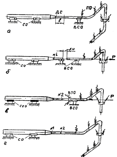 Рис. 6.6. Последовательность технологических операций на участке паропровода при переварке поврежденного (дефектного) соединения: а - вырезка патрубка l с дефектным стыком (ДС); б - размещение нового патрубка-вставки; выполнение стыка № 1; в - сборка стыка № 2 и его выполнение; г - приведение участка паропровода в исходное рабочее положение [удаление временных опор ВПО и ВСО; снятие защемления, т.е. перевод опор защемленных (СОЗ) в скользящие опоры (СО) на коллекторе] В любом случае длина