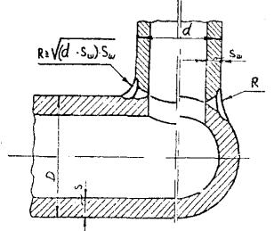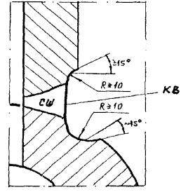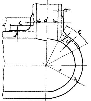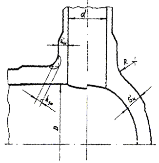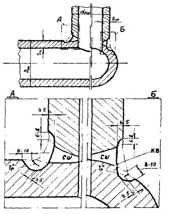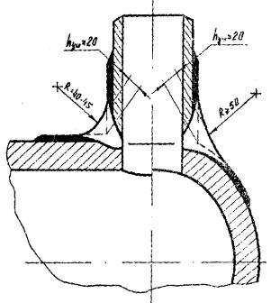 Примечание. Наплавленный металл электродов Э-09Х1М должен иметь отношение содержания марганца к сере Mn/S более 70. 13.4. Старый поврежденный штуцер удаляется в несколько этапов (рис. 13.1): I - разрезка кольцевого шва, соединяющего штуцер с трубой; II - разрезка штуцера вблизи углового шва; III - разрезка углового шва; IV - удаление остатков углового шва механическим способом; V - обработка механическим способом (шлифованием, полированием) поверхности коллектора для проведения контроля качества основного металла. Этапы I - III выполняют огневой резкой или резкой механическим способом (фрезерованием, проточкой). Рис. 13.1. Последовательность операций по удалению поврежденного штуцера (DУ-100) на коллекторе из стали 12Х1МФ: I - III - линии огневой резки; IV - V - линии механической обработки (IV) и после удаления остатков старого углового шва (V) 13.5. Качество поверхности коллектора в местах под сварку и наплавку контролируют методом МПД или визуальным способом после травления поверхности 15 % водным раствором азотной кислоты для выявления макродефектов; оценку качества проводят по нормам РД 34 15.027-93. Дополнительно проводят микроанализ с помощью реплик (раздел 14 настоящего РД; степень микроповрежденности устанавливают согласно требованиям п. 13.1 настоящего РД). При использовании старого штуцера проводят контроль качества его основного металла аналогично изложенному для коллектора. При использовании нового штуцера рекомендуется проводить макроанализ травленой поверхности в местах под сварку и наплавку аналогично изложенному выше для коллектора. 13.6. Технология приварки штуцеров перлитными электродами Э-09Х1М. 13.6.1. Конструкция нового штуцерного соединения, выполняемого по данной технологии, включает коллекторы со штуцером, угловой шов и усиливающую кольцевую наплавку воротникового типа. Расчетная схема штуцерного соединения представлена на рис. 13.2; расчетная зона перехода от штуцера к коллектору - на рис. 13.3 и расчетные размеры параметров соединения - в табл. 13.2. Рис. 13.2. Расчетная схема штуцерного сварного соединения коллектора из стали 12Х1МФ с усиливающей наплавкой воротникового типа и угловым швом, выполненным электродами Э-09Х1М Таблица 13.2 Геометрические параметры штуцерных сварных соединений стали 12X1МФ с металлом углового шва и усиливающих наплавок типа 09X1М без термической обработки для коллекторов котлов с максимальной температурой эксплуатации 510 °С