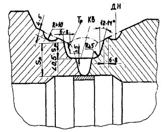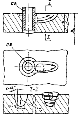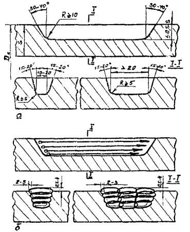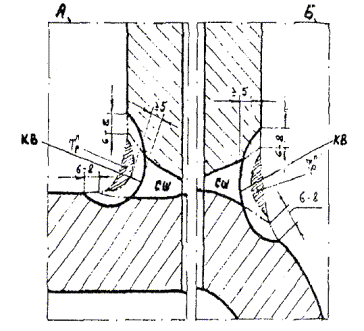 Примечания. 1. Подогрев допускается проводить любым способом: индукционным, электропечным и газопламенным по технологии согласно РД 34 15.027-93. 2. Температура подогрева должна регистрироваться самопишущими приборами от термопар по технологии согласно рекомендациям РД 34 15.027-93. Рис. 7.1. Рекомендуемая форма выборки (поперечное сечение шва) после удаления поврежденного металла с кольцевой трещиной (Трк): КВ - контур кольцевой выборки; СШ - старый шов Рис. 7.2. Рекомендуемые переходы (R - радиусы скругления, углы скоса кромок) в районе кольцевой выборки (см. рис. 7.1) Рис. 7.3. Рекомендуемая форма выборки (поперечное сечение шва) после удаления поврежденного металла с поперечными трещинами (Трп): СШ - старый шов; КВ - контур кольцевой выборки; А и Б согласно схеме на рис. 7.1 Рис. 7.4. Рекомендуемый контур выборки после удаления поврежденного металла с кольцевой трещиной (Трк): СШ - старый шов; КВ - контур кольцевой выборки 7.4.6. Сварка выполняется многослойным способом валиками толщиной 5 - 8 мм и шириной 12 - 20 мм электродами диаметром 3 и 4 мм с силой тока 90 - 120 и 140 - 180 А соответственно. Примерная последовательность заполнения местной и кольцевой выборок показана на рис. 7.5 и 7.6; формы подварочных швов - на рис. 7.5 - 7.7. 7.4.7. Термическая обработка проводится по режиму высокого отпуска (табл. 7.3) сразу по окончании сварки подварочных швов, не допуская снижения температуры ниже 250 °С. Способ нагрева - индукционный или электропечной; регистрация температур осуществляется самопишущими приборами; технология нагрева и контроля температур проводится согласно РД 34 15.027-93. 7.5. Технология выполнения наплавок воротникового типа. 7.5.1. Усиливающая или восстановительная наплавка наносится для укрепления конструкции сварного тройника (табл. 7.1). Таблица 7.3 Режимы высокого отпуска отремонтированных сварных тройников