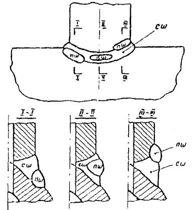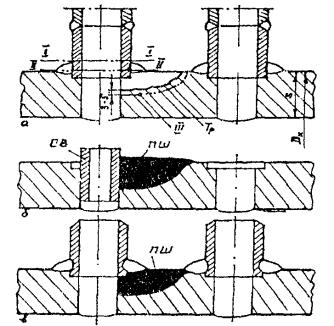Примечания. 1. Скорость нагрева до 600 ºС должна быть не более 50 °С/ч и выше 600 °С - не менее 100 °С/ч. 2. Скорость охлаждения с 720 - 760 °С до 300 °С должна быть не более 100 °С/ч. Рис. 7.5. Рекомендуемая последовательность многослойного заполнения местной кольцевой выборки при наплавке горизонтальных (а) и вертикальных (б) валиков: СШ - старый шов Рис. 7.6. Рекомендуемая последовательность выполнения кольцевых валиков при многослойном заполнении кольцевой выборки: а - наплавка валиков в нижнем, горизонтальном и потолочном положениях; б - наплавка валиков в вертикальном положении Рис. 7.7. Допустимые местные подварки выборок в сварных тройниках, эксплуатирующихся при температуре пара ниже 510 °С: СШ - старый шов; ПШ - подварочный шов 7.5.2. Требования к форме и размерам наплавок: наплавку наносят по всему периметру углового шва, она может быть симметричной по отношению к угловому шву (рис. 7.8) или смещенной в сторону корпуса или штуцера, подлежащих укреплению (рис. 7.9); усиливающая наплавка должна перекрывать старый угловой и подваренный швы ремонтируемого сварного тройника (рис. 7.8 и 7.9). Форма этой наплавки одинаковая как для сварного соединения с ремонтной подваркой, так и без нее (табл. 7.1). Восстановительная наплавка (табл. 7.1) выполняется симметричной по отношению к угловому шву (рис. 7.8); Рис. 7.8. Рекомендуемая форма усиливающей кольцевой наплавки (симметричное расположение в сторону штуцера и корпуса трубы тройника) с подваренным швом: а - местной выборки; б - кольцевой выборки; УН - усиливающая (укрепляющая) наплавка; ПШ - подварочный шов; СШ - старый шов Рис. 7.9. Рекомендуемые формы усиливающих наплавок (УН), укрепляющих тело корпуса трубы (а) и штуцера (б) в районе сварного соединения с угловым старым швом (СШ) тройника. Размеры усиливающих наплавок (lн, hн - ширина и толщина) определяются расчетом на прочность размеры наплавок (толщина и ширина) определяют расчетным путем. Рекомендуется наплавку выполнять толщиной не менее 10 мм и шириной - согласно рекомендациям рис. 7.8 и 7.9. При этом участок наплавки на укрепляющем трубном элементе должен иметь ширину не менее 50 мм, т.е. lн ³ 50 мм. 7.5.3. Наплавки выполняют многослойным способом (например, двухслойным) кольцевыми валиками толщиной 4 - 6 мм и шириной 12 - 18 мм аналогично схемам, показанным на рис. 7.6. 7.5.4. Сварку усиливающих и восстановительных наплавок выполняют электродами типа Э-09Х1МФ с подогревом (табл. 7.2) и проведением послесварочной термической обработки по режиму высокого отпуска (табл. 7.3). Режимы тока - 80 - 120 и 140 - 180 А при сварке электродами диаметром 3 и 4 мм соответственно. Требования по технологии проведения термической обработки указаны в п. 7.4.7 настоящего РД. При ремонте, включающем операции сварки подварочного шва и усиливающей наплавки, термическую обработку сварного тройника проводят один раз после выполнения усиливающей наплавки, причем перерыв во времени между операциями сварки подварочного шва и усиливающей наплавки с обязательным сохранением требуемой температуры подогрева не допускается (табл. 7.2). 7.5.5. Поверхность углового шва после ремонта, включая кольцевые усиливающие и восстановительные наплавки, должна быть подготовлена для контроля механическим способом путем шлифования абразивным инструментом до получения необходимой гладкой поверхности и требуемого радиуса скругления (рис. 7.10). Данная оп