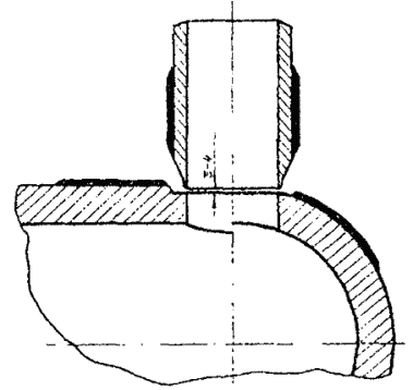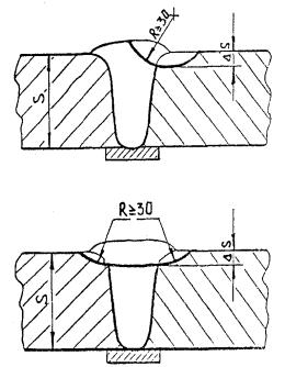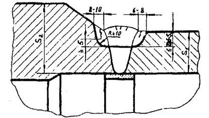 * ЗТВ - зона термического влияния сварного соединения; ** ВТО - восстановительная термическая обработка по режиму одно- или двухкратной нормализации с высоким отпуском. Режим устанавливается с учетом структурного состояния и микроповрежденности металла тройника. 7.3. Ремонт тройниковых сварных соединений без подварки места выборки. 7.3.1. Ремонт проводят при соблюдении следующих требований: глубина местной выборки не превышает 3 мм и 10 % фактической толщины стенки трубного элемента тройника, при этом в расчет принимают меньшую толщину стенки штуцера или корпуса; протяженность местной выборки должна быть не более 25 % периметра углового шва; допускается на одном тройнике две выборки, расположенные в диаметрально противоположных местах по периметру углового шва; утоненная выборкой толщина стенки или высота углового шва не должны быть меньше расчетных допустимых размеров для данного типа тройника; ремонтируемый тройник должен соответствовать требованиям ОСТ 108.031.10-85 по конструкционной прочности (п. 7.3 настоящего РД); данный ремонт можно проводить на тройнике только один раз. 7.3.2. Поврежденный металл удаляется механическим способом путем вышлифовки с помощью абразивного инструмента, при этом должен обеспечиваться плавный переход от дна выборки к наружной поверхности сварного соединения с радиусом округления не менее 30 мм. Поверхность выборки должна быть ровной, без рисок, насечек и резких переходов. 7.3.3. Поверхность выборки должна быть проконтролирована методом МПД или внешним осмотром с помощью лупы 4-7-кратного увеличения после травления 15 % водным раствором азотной кислоты с целью подтверждения полного удаления трещин. Рекомендуется дополнительно исследовать поверхность выборки металлографическим методом с помощью реплик для подтверждения отсутствия недопустимой микроповрежденности металла (см. п. 7.1.1 настоящего РД); реплики следует снимать с двух-трех точек в месте расположения удаленных трещин. 7.4. Ремонт тройниковых сварных соединений путем подварки места выборки с послесварочной термической обработкой. 7.4.1. Этот способ применяют к тройниковым сварным соединениям с ограничением по глубине и протяженности местных выборок (табл. 7.1). 7.4.2. Технология ремонта включает следующие операции: удаление поврежденного металла и контроль полноты удаления; сварка подварочного шва; проведение термической обработки сварного соединения с местной подваркой по режиму высокого отпуска; обработка механическим способом поверхности подварочного шва и при необходимости углового шва по всему периметру с проведением контроля качества. Дополнительной может быть операция по выполнению усиливающей наплавки воротникового типа в месте углового шва. 7.4.3. Удаление поврежденного металла проводят механическим способом путем шлифования поверхности с помощью абразивного инструмента. Полнота удаления поврежденного металла контролируется методом МПД или визуально с помощью лупы 4-7-кратного увеличения после травления поверхности выборки 15 % водным раствором азотной кислоты. Рекомендуется дополнительно исследовать поверхность металлографическим методом с помощью реплик для подтверждения полноты удаления недопустимой микроповрежденности металла (см. п. 7.1.1 настоящего РД) в двух-трех точках. 7.4.4. Рекомендуемая форма выборки для тройни