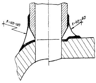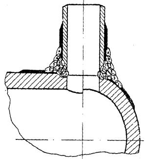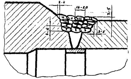 Основной является конструкция штуцерного соединения без остающегося подкладного кольца. Допускается конструкция с подкладным цилиндрическим кольцом, которое после термического отдыха сварного соединения рекомендуется удалять механическим способом (шлифованием, фрезерованием). Подкладное кольцо может быть изготовлено точеным или вальцованным из полосы или трубной заготовки; материал кольца - сталь 12Х1МФ или 20. Рис. 13.3. Зона перехода от штуцера к коллектору (относится к рис. 13.2) 13.6.2. Усиливающие наплавки на штуцер и коллектор наносят кольцевыми валиками шириной 12 - 16 мм и высотой 3 - 5 мм в два слоя (рис. 13.4 и 13.5). Сварку выполняют электродами диаметром 3 мм силой тока 90 - 110 и 100 - 120 А для наплавки на штуцер и коллектор соответственно и с подогревом 200 - 250 и 250 - 300 °С для штуцера и коллектора соответственно. Способ нагрева любой. Регистрация температур - с помощью термокарандашей или термопар с приборами (милливольтметром, потенциометром). После сварки поверхность наплавки подвергают механической обработке (шлифованию) до получения требуемых размеров и форм (рис. 13.4 и 13.5; табл. 13.2). Качество сварки оценивается по результатам макроанализа визуальным способом с применением лупы 4 - 7-кратного увеличения поверхности наплавки травленной 15 % водным раствором азотной кислоты; нормы допустимых дефектов соответствуют РД 34 15.027-93. Рис. 13.4. Схема нанесения усиливающей наплавки электродами Э-09Х1М на тело штуцера: а - подготовленный под наплавку штуцер; б - последовательность двухслойной наплавки кольцевыми валиками; в - форма усиливающей наплавки после механической обработки (размеры см. в табл. 13.2) Рис. 13.5. Схема нанесения усиливающей наплавки электродами Э-09Х1М на тело коллектора 13.6.3. В собранных под сварку деталях кольцевой зазор в корневой части должен составлять 3 - 4 мм для штуцера без подкладного кольца (рис. 13.6) и 5 - 8 мм - для штуцера с подкладным цилиндрическим кольцом (рис. 13.7). Собранные элементы скрепляют двумя прихватками длиной по 40 - 50 мм и высотой 4 - 6 мм, располагающимися в диаметрально противоположных местах по периметру кольцевого зазора. Прихватки выполняют электродами диаметром 3 мм, ток при сварке - 90 - 110 А с подогревом деталей при температуре 250 - 300 °С. Способ нагрева любой: контроль температур осуществляют согласно рекомендациям п. 13.6.2 настоящего РД. Рис. 13.6. Собранные под сварку элементы штуцерного соединения без подкладного остающегося кольца. Усиливающие наплавки выполнены электродами Э-09Х1М Рис. 13.7. Собранные под сварку элементы штуцерного соединения с подкладным цилиндрическим кольцом. Усиливающие наплавки выполнены электродами Э-09Х1М 13.6.4. Угловой шов выполняется многослойным способом (рис. 13.8) кольцевыми валиками шириной по 12 - 18 мм и высотой 6 - 8 мм с использованием электродов типа Э-09Х1М диаметром 3 и 4 мм на режимах тока 100 - 120 к 140 - 180 А соответственно; заполнение разделки обеспечивается по всему сечению с получением усиления шва высотой около 15 - 20 мм. Рис. 13.8. Схема последовательности заполнения разделки и усиления углового шва кольцевыми валиками с помощью электродов Э-09Х1М 13.6.5. При сварке должен быть обеспечен предварительный и сопутствующий подогрев свариваемых деталей при температуре 250 - 300 °С. Зона равномерного подогрева включает полностью тело штуцера и кольцевой участок коллектора шириной 400 - 500 мм по всему периметру