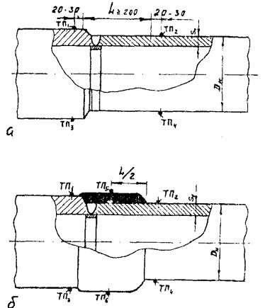 Примечания. 1. Подогрев допускается проводить любым способом: индукционным, электропечным и газопламенным по технологии согласно РД 34 15.027-93. 2. Термопары для регистрации температур располагаются равномерно по периметру ремонтируемого стыка в четырех местах и с каждой стороны сварного шва (общее количество - 8 термопар). Рис. 9.4. Рекомендуемая последовательность многослойного заполнения места выборки ремонтируемого сварного соединения (поперечное сечение): 1 - 10 - кольцевые валики; 10 - отжигающий валик; ТП - термопара для регистрации температуры подогрева при сварке; СШ - старый шов 9.2.4. Сварное соединение с подварочным швом подвергается термической обработке по режиму высокого отпуска (табл. 9.3). Технология нагрева осуществляется согласно РД 34 15.027-93 (рис. 9.5). Рис. 9.5. Расположение термопар (ТП) для регистрации температурных режимов при проведении термической обработки (высокого отпуска) сварного соединения с подварочным швом: СШ - старый шов; ПШ - подварочный шов Таблица 9.3 Режимы высокого отпуска отремонтированных сварных соединений фасонных деталей