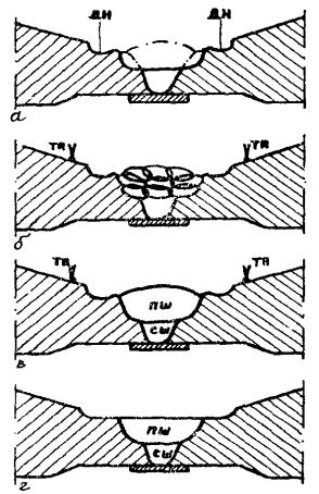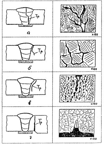 Рис. П1.1. Типичные повреждения соединений паропроводов из хромомолибденованадиевых сталей: а - трещина хладноломкости; б - локальное повреждение при повторном нагреве в околошовной зоне; в - трещина ползучести в ЗТВ соединения; г - трещина усталости Приложение 2(справочное) Типичные повреждения отремонтированных стыковых сварных соединений паропроводов из хромомолибденованадиевых сталей (негативное влияние сварочно-ремонтной технологии)