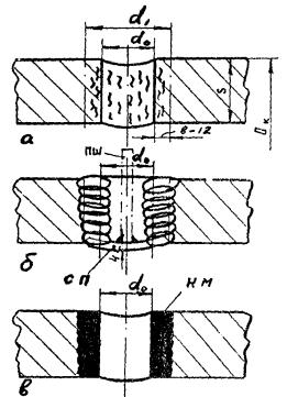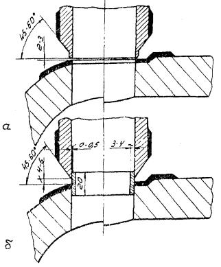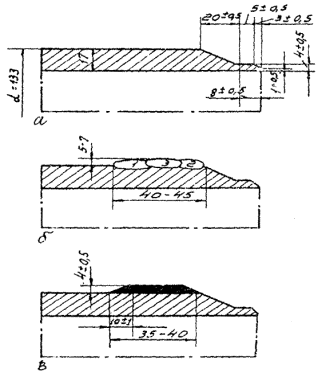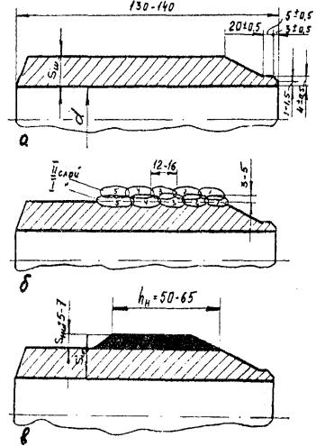 Примечание. Выбор типа (и марки) электродов для наплавки проводят с учетом температуры эксплуатации штуцерных сварных соединений (табл. 4.1 и 13.1). Рис. 13.11. Подготовка штуцера DУ-100 под сварку углового шва без подкладного кольца аустенитными электродами: а - подготовленный под наплавку штуцер; б - расположение валиков наплавки; в - поверхность наплавки после механической обработки