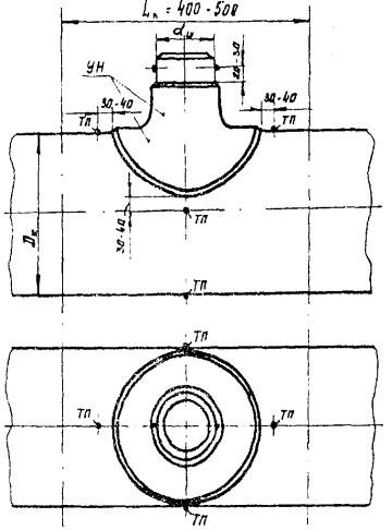 d - диаметр отверстия в корпусе под штуцер; Dн - наружный диаметр корпуса; S - толщина стенки корпуса, ее следует брать фактической (рекомендация составителей). 7.2. Ремонт проводится по одному из вариантов (табл. 7.1): путем удаления поврежденного металла без последующей подварки места выборки; путем подварки мест выборок с проведением послесварочной термической обработки; путем применения усиливающих и восстановительных наплавок воротникового типа в районе углового шва как профилактической меры повышения конструкционной прочности тройников; путем замены поврежденного сварного тройника на новый. Таблица 7.1 Рекомендуемые варианты сварочной технологии ремонта тройниковых сварных соединений паропроводов
