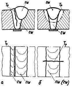 Примечания. 1. Одной из основных технологических причин, способствующих преждевременному повреждению сварных тройников после ремонта для всех случаев разрушений (рис. П4.1 и П4.2), является применение сварочных материалов с низкими жаропрочными свойствами. 2. Трп - поперечная трещина на рис. П4.2,б, развитие которой идет с наружной поверхности подварки. 3. Помимо рассмотренных в приложении 4 технологических причин, на повреждения отремонтированных сварных тройников влияют и другие причины (см. приложение 3). Рис. П4.1. Типичные эксплуатационные повреждения сварных тройников с ремонтными подварками. Кольцевые трещины (Трк): а - в подваренном шве (ПШ); развитие от ЗТВрп; б - в старом шве (СШ); развитие в глубь металла Рис. П4.2. Типичные эксплуатационные повреждения сварных тройников с ремонтными подварками: а - кольцевые трещины (Трк) по ЗТВрп в глубь металла; б - поперечные трещины (Трп) в подварочном шве (ПШ); КрЗ крупнозернистая структура металла в старом шве Приложение 5Типичные повреждения стыковых сварных соединений разнотолщинных трубных элементов длительно эксплуатирующихся паропроводов из хромомолибденованадиевых сталей при температуре 510 - 560 °С