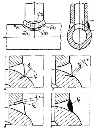 Примечание. На первом месте указаны преимущественно главные причины повреждения сварных тройников для каждого вида разрушения. Как правило, на повреждение влияет комплекс причин, основные из которых указаны в таблице. Рис. П3.1. Типичные эксплуатационные повреждения сварных тройников паропроводов из хромомолибденованадиевых сталей: а - кольцевая трещина (Трк) в околошовной зоне; б - кольцевая трещина в ЗТВрп на «спинке» (Тркс); в - кольцевая трещина в ЗТВрп штуцера (Тркш); г - поперечные трещины в металле углового шва (Трп); (Тркб) - кольцевая трещина в ЗТВрп на «плечике» тройникового сварного соединения Приложение 4(справочное) Эксплуатационные повреждения отремонтированных сварных тройников паропроводов из хромомолибденованадиевых сталей (негативное влияние сварочно-ремонтной технологии)