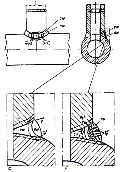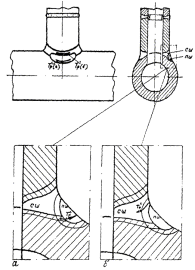 Рис. П2.1. Типичные повреждения сварных соединений с ремонтной подваркой паропроводов из хромомолибденованадиевых сталей: а - кольцевая трещина в старом шве (СШ). Межкристаллитное повреждение по механизму ползучести; б - поперечная трещина в подварочном шве (ПШ) с переходом в старый шов и ЗТВ соединения. Транскристаллитное повреждение по механизму хладноломкости Приложение 3(справочное) Характер и причины повреждений тройниковых сварных соединений паропроводов из хромомолибденованадиевых сталей, эксплуатирующихся в условиях ползучести