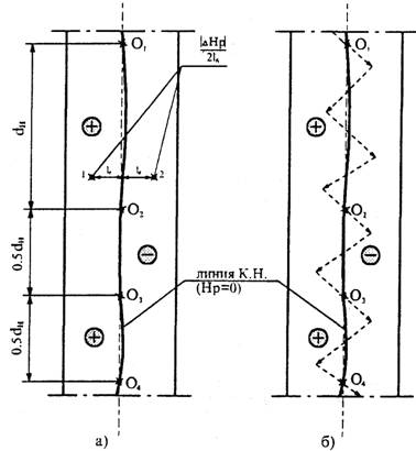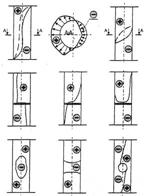 Рис. 3. Варианты расположения линий К.Н. на трубах. На рис. 5, в показано расположение линии с нулевым значением, поля Нр, вдоль периметра в сечении трубы, соответствующей точке D на огневой образующей. Линия Нр = 0, в соответствии с методикой, характеризует расположение площадки скольжения в данном сечении трубы (узел Д). Аналогичные площадки скольжения имеются на трубе № 41 и в других сечениях, где происходит смена знака деформации и измеряемого поля Нр.