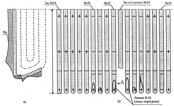 рис.9 представлены результаты контроля трубы № 25 (ст. 20, Æ 60 × Следует отметить, что представленные на рис. 8,а и 8,б значения коэффициента интенсивности изменения поля Нр получены при использовании специализированных магнитометров, изготавливаемых в НПО "Энергодиагностика". При использовании других приборов значения указанных коэффициентов могут быть другими по метрологическим причинам. Повышенные значения коэффициента интенсивности К = D Нр/lк получены также для участков труб с большими отложениями продуктов коррозии, т.е. для участков труб, где на внутренней поверхности труб идет интенсивный процесс коррозии металла. На рис. 10, а представлены результаты контроля экранной трубы № 15 левого бокового экрана котла .№ 9 ТП-87 ТЭЦ-20 Мосэнерго. В результате анализа вырезанного. образца с зоной КН на этой трубе на огневой образующей выявлены отложения 1669 г/м2 (норма 400 г/м2). Под слоем отложений обнаружено пятно подшламовой коррозии с утонением стенки на 1¸1,5 мм (рис. 10,б). 5.5. Определение участков труб, предрасположенных к повреждениям на змеевиках пароперегревателя. На змеевиках пароперегревателя контроль ведется вдоль образующей трубы, обращенной к топочным газам. Критерием для определения зон КН на трубах пароперегревателей остается тот же - скачкообразное изменение поля Нр с расстоянием между нулевыми или экстремальными значениями, равном (0,5; 1)dн. В отличие от экранных труб, на трубах пароперегревателя в зонах КН нередко встречаются случаи скачкообразного изменения поля Нр без смены знака. Такие случаи, как правило, имеют место на участках труб, работающих в условиях перегрева металла выше расчетной температуры.