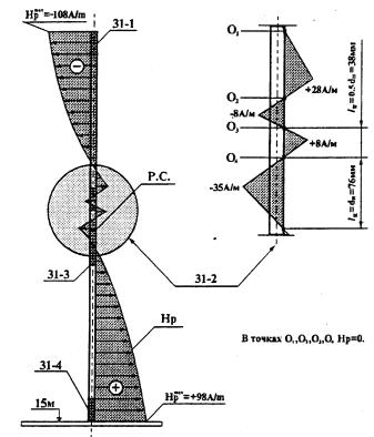 На рис. 2.2 показано распределение нормальной составляющей напряженности магнитного поля (Нр), зафиксированное вдоль огневой образующей трубы № 31. Эпюра распределения величины Нр здесь построена по фиксированным значениям на участках 31-1, 31-2, 31-3, 31-4 и несколькими промежуточными точками контроля. На этом же рис. 2.2 для участка 31-2 показано распределение величины Нр в зоне КН. В соответствии с пунктом 5.2 методики здесь зафиксировано скачкообразное изменение величины Нр с нулевыми ее значениями в пяти точках подряд и с базовым расстоянием между нулевыми значениями, равном (0,5; 1)dнар.