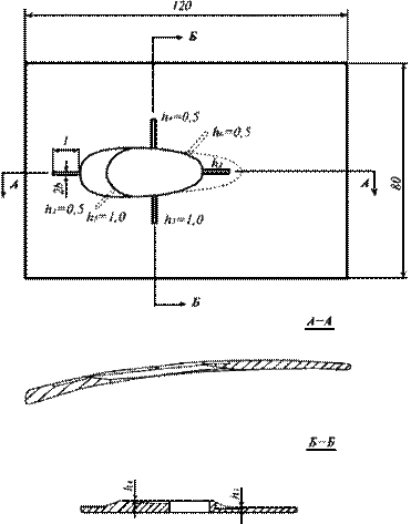 где Uн < Uи < Uв - максимумы сигналов над рисками глубиной hн, hи и hв соответственно. 4.3 Контроль зон вокруг отверстий под демпферные проволоки 4.3.1 Воспользоваться при настройке дефектоскопа (см. п.3.3) контрольным образцом КО2 (см. рисунок 2). 4.3.2 Установить ВТП параллельно краю отверстия и нажать кнопку "ИЗМЕРЕНИЕ". 4.3.3 Перемещать ВТП вдоль края отверстия, не допуская перекосов плоскости торца ВТП относительно плоскости контролируемой поверхности. 4.3.4 При срабатывании сигнализации, плавно перемещая ВТП, добиться максимального отклонения стрелки индикатора, отметить дефектное место и записать показания индикатора. 4.3.5 Визуально осмотреть дефектное место. При наличии внешних отложений провести зачистку дефектного участка, его повторное сканирование и записать уточненные показания индикатора. 4.3.6 Оценить глубину выявленных трещин по показаниям индикатора, выполнив операции, идентичные описанным в пп.4.2.6 - 4.2.7. 4.4 Контроль зон, удаленных от кромки лопаток 4.4.1 Воспользоваться при настройке дефектоскопа (см. п.3.3) контрольным образцом КО3 (см. рисунок 3). 4.4.2 Установить ВТП на поверхность контролируемого участка лопатки и нажать кнопку "ИЗМЕРЕНИЕ". 4.4.3 Просканировать контролируемую поверхность, перемещая ВТП вдоль образующих криволинейных участков. 4.4.4 При необходимости перемещения ВТП