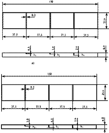 а - ОСП-К-25х150х6-Р1-Ст; б - ОСП-К-25х150х6-Р2-Ст. Рисунок 5 - Тарировочные образцы 4.2.7.3 Перемещая ВТП по тарировочному образцу, получить от рисок соответствующей глубины значения максимумов, наиболее близкие к полученному над дефектным участком контролируемой лопатки, и вычислить измеряемую глубину hи по формуле