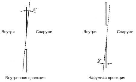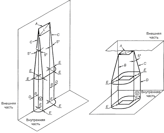 Для оборудования, предназначенного для установки В ПОМЕЩЕНИЯХ С ОГРАНИЧЕННЫМ ДОСТУПОМ (допуски на превышение температуры даны в таблице 4А, за исключением внешних металлических частей, которые предназначены для теплообмена или имеют видимое предостережение), допускается превышение температуры до 65 К. 4.5.2 Устойчивость к нагреву в условиях ненормальной работыТермопластичные части, удерживающие элементы под ОПАСНЫМ НАПРЯЖЕНИЕМ, должны быть устойчивыми к нагреву в условиях ненормальной работы. Соответствие проверяют испытанием части методом давления шариком при воздействии повышенной температуры согласно МЭК 60695-10-2 [11]. Испытание не проводят, если по своим физическим характеристикам материал удовлетворяет требованиям испытания. Испытание проводят в термокамере при температуре на (40 ± 2) К выше максимальной температуры для данной части, определенной во время испытания по 4.5.1. Термопластичную часть, поддерживающую элементы ПЕРВИЧНОЙ ЦЕПИ, испытывают при температуре не менее 125 °С. 4.6 Отверстия в кожухеОборудование, которое предназначено для использования в различных положениях (см. 1.3.6), испытывают по 4.6.1 и 4.6.2 в каждом положении. Примечание - Дополнительные требования к отверстиям в КОЖУХАХ приведены в 2.1.1. 4.6.1 Отверстия в верхней поверхности и боковых сторонахОтверстия в верхней и боковых частях КОЖУХОВ, за исключением отверстий в КОЖУХАХ ПЕРЕНОСНОГО ОБОРУДОВАНИЯ (см. 4.6.4), должны размещаться или выполняться так, чтобы исключить возможность контакта с оголенными проводящими частями. Примечание 1 - Необходимо учитывать энергетические опасности как создаваемые замыканием изоляции, так и доступом ОПЕРАТОРА к частям под ОПАСНЫМ НАПРЯЖЕНИЕМ (например, посредством металлических украшений). Отверстия, размещенные за дверцами, щитами управления, крышками, и все то, что может быть открыто или удалено оператором, не требуют выполнения условия их закрытия или установки на место. Если участок боковой стенки ПРОТИВОПОЖАРНОГО КОЖУХА находится на поверхности, составляющей угол 5° (см. рисунок 4Е), то для этого участка также применимы ограничения, приведенные в 4.6.2 для размеров отверстий в основании ПРОТИВОПОЖАРНОГО КОЖУХА. Соответствие проверяют осмотром и измерением. За исключением частей ПРОТИВОПОЖАРНОГО КОЖУХА, удовлетворяющих требованиям 4.6.2, отверстия должны рассматриваться и соответствовать следующим требованиям (другие конструкции не исключены): - размер отверстий не должен превышать 5 мм в любом измерении; - ширина отверстий не должна превышать 1 мм, независимо от длины; - верхние отверстия должны предотвращать проникновение вертикально падающих предметов (см. примеры на рисунке 4В); - боковые отверстия должны предусматривать жалюзи, форма которых препятствует проникновению вертикально падающих предметов (см. примеры на рисунке 4С); - верхние или боковые отверстия, как показано на рисунке 4D, не должны быть расположены вертикально или в пределах объема V, ограниченного углом 5° для вертикальной проекции вплоть до размера отверстия L над оголенными проводящими частями: под ОПАСНЫМ НАПРЯЖЕНИЕМ или представляющими энергетическую опасность по 2.1.1.5. Примечание 2 - Примеры на рисунках 4В, 4С, 4D и 4Е иллюстрируют возможности выполнения этих требований. Рисунок 4В - Примеры поперечного сечения конструкции отверстий Рисунок 4С - Приме