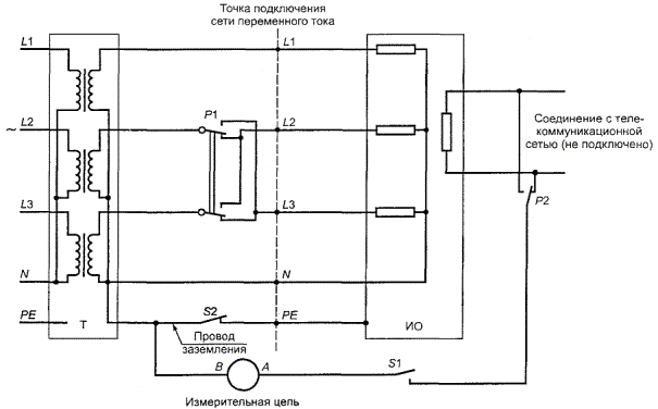 Примечание - См. ГОСТ Р 50571.23. 5.1.8 Токи прикосновения к телекоммуникационным сетям и от этих сетейПримечание - В этом пункте ссылки на «порты подключения ТЕЛЕКОММУНИКАЦИОННОЙ СЕТИ» (или телекоммуникационные порты) относятся к тем точкам соединения, к которым ТЕЛЕКОММУНИКАЦИОННАЯ СЕТЬ подключается. Такие ссылки не распространяются на другие порты данных, такие как последовательный и параллельный, а также разъемы для подключения клавиатуры, игры, джойстика, и т.д. 5.1.8.1 Ограничение тока прикосновения к ТЕЛЕКОММУНИКАЦИОННОЙ СЕТИ ТОК ПРИКОСНОВЕНИЯ от оборудования, питающегося от СЕТИ ПИТАНИЯ ПЕРЕМЕННОГО ТОКА, к ТЕЛЕКОММУНИКАЦИОННОЙ СЕТИ должен быть ограничен. Соответствие проверяют, используя испытательную цепь, приведенную в 5.1.3. Испытания не проводят для оборудования, у которого цепь, подключаемая к ТЕЛЕКОММУНИКАЦИОННОЙ СЕТИ, соединена с защитным заземлением или клеммой ФУНКЦИОНАЛЬНОГО ЗАЗЕМЛЕНИЯ в оборудовании; ток от ИО к ТЕЛЕКОММУНИКАЦИОННОЙ СЕТИ считают нулевым. Для оборудования, имеющего больше, чем одну цепь, подключаемую к ТЕЛЕКОММУНИКАЦИОННОЙ СЕТИ, испытание проводят только по одному варианту для цепи каждого типа. Для оборудования, не имеющего клеммы защитного заземления, переключатель S2 в цепи проводника заземления, если он подключен к клемме ФУНКЦИОНАЛЬНОГО ЗАЗЕМЛЕНИЯ в ИО, не замыкают. В противном случае он замкнут. Клемму В измерительного прибора соединяют с нейтральным проводником сети питания. Клемму А коммутируют при измерении переключателем S1,a полярность- переключателем Р2 при подключении к порту ТЕЛЕКОММУНИКАЦИОННОЙ СЕТИ. Для однофазного оборудования испытание проводят во всех комбинациях переключателей полярности Р1 и Р2. Для трехфазного оборудования испытание проводят в обеих позициях переключателя полярности Р2. После измерения в каждом проверяемом условии оборудование устанавливают в начальное состояние. Измерения выполняют, используя один из измерительных приборов по приложению D, как описано в 5.1.6. Ни одно из значений, измеренных в соответствии с 5.1.8.1, не должно превышать 0,25 мА среднеквадратичного значения. 5.1.8.2 Суммирование ТОКОВ ПРИКОСНОВЕНИЯ от ТЕЛЕКОММУНИКАЦИОННЫХ СЕТЕЙ. Примечание - Приложение W объясняет требования 5.1.8.2. ИО, предназначенное для соединения с ТЕЛЕКОММУНИКАЦИОННОЙ СЕТЬЮ многих точек нескольких единиц другого оборудования связи, не должно создавать опасность для ПОЛЬЗОВАТЕЛЕЙ и ОБСЛУЖИВАЮЩЕГО ПЕРСОНАЛА ТЕЛЕКОММУНИКАЦИОННОЙ СЕТИ из-за суммирования ТОКОВ ПРИКОСНОВЕНИЯ. При проверке этих требований приняты следующие обозначения: I1 - ТОК ПРИКОСНОВЕНИЯ, полученный от другого оборудования через ТЕЛЕКОММУНИКАЦИОННУЮ СЕТЬ в телекоммуникационном порту ИО; åI1 - сумма ТОКОВ ПРИКОСНОВЕНИЯ, полученных от другого оборудования во всех телекоммуникационных портах ИО; I2 - ТОК ПРИКОСНОВЕНИЯ от СЕТИ ПИТАНИЯ ПЕРЕМЕННОГО ТОКА ИО. Допускается, чтобы в каждый телекоммуникационный порт от другого оборудования втекал ток 0,25 мА (I1), если не известно, что фактический электроток от другого оборудования является более низким. Следующие требования, в зависимости от применяемости, должны быть выполнены. а) ИО с заземленными телекоммуникационными портами связи. Для ИО, у которого каждый телекоммуникационный порт соединен с основной клеммой защитного заземления ИО, перечисления 1) - 3) дол