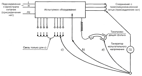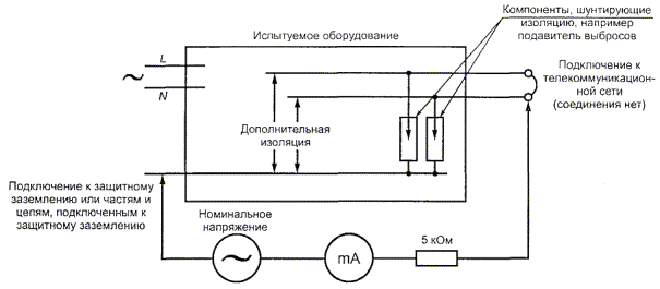 G.3 Определение напряжения переходного процесса телекоммуникационной сетиЕсли НАПРЯЖЕНИЕ ПЕРЕХОДНОГО ПРОЦЕССА ТЕЛЕКОММУНИКАЦИОННОЙ СЕТИ неизвестно для данной ТЕЛЕКОММУНИКАЦИОННОЙ СЕТИ, его считают равным: 1 500 Впик, если цепь соединена с НТС-1 или НТС-3 ЦЕПЯМИ СЕТИ СВЯЗИ; 800 Bпик, если цепь соединена с БСНН или НТС-2 ЦЕПЯМИ СЕТИ СВЯЗИ. G.4 Определение требуемого напряжения стойкости изоляцииа) Сетевые и внутренние переходные процессы ПЕРВИЧНАЯ ЦЕПЬ, подвергающаяся воздействию полного значения переходного процесса сети Для такой ЦЕПИ переходные процессы, возникающие в ТЕЛЕКОММУНИКАЦИОННОЙ СЕТИ, игнорируют и применяют следующие правила. Правило 1. Если ПИКОВОЕ РАБОЧЕЕ НАПРЯЖЕНИЕ Uпp меньше, чем пиковое значение номинального напряжения ПИТАНИЯ ОТ СЕТИ ПЕРЕМЕННОГО ТОКА, то ТРЕБУЕМОЕ НАПРЯЖЕНИЕ СТОЙКОСТИ - НАПРЯЖЕНИЕ ПЕРЕХОДНОГО ПРОЦЕССА СЕТИ, определенное в G.2 Uст.тр = Uс.пер. Правило 2. Если ПИКОВОЕ РАБОЧЕЕ НАПРЯЖЕНИЕ Uпp больше, чем пиковое значение номинального напряжения ПИТАНИЯ ОТ СЕТИ ПЕРЕМЕННОГО ТОКА, то ТРЕБУЕМОЕ НАПРЯЖЕНИЕ СТОЙКОСТИ - ПЕРЕХОДНОЕ НАПРЯЖЕНИЕ СЕТИ, определенное в G.2, плюс разница между ПИКОВЫМ РАБОЧИМ НАПРЯЖЕНИЕМ и пиковым значением номинального напряжения ПИТАНИЯ ОТ СЕТИ ПЕРЕМЕННОГО ТОКА Uст.тр = Uс.пер + Uпр - Uпик.с. ВТОРИЧНАЯ ЦЕПЬ, чья ПЕРВИЧНАЯ ЦЕПЬ подвергается воздействию полного значения переходного процесса сети Для такой ЦЕПИ ТРЕБУЕМОЕ НАПРЯЖЕНИЕ СТОЙКОСТИ определяют следующим образом, игнорируя переходные процессы, возникающие в ТЕЛЕКОММУНИКАЦИОННЫХ СЕТЯХ. Применяют правила 1 и 2 с учетом НАПРЯЖЕНИЯ ПЕРЕХОДНОГО ПРОЦЕССА СЕТИ, определенного в G.2, и замененного напряжением, на один шаг меньшим выбранного из следующего ряда: 330, 500, 800, 1500, 2500, 4000, 6000 и 8000 В пикового значения. Выбор меньшего значения не разрешается для плавающей ВТОРИЧНОЙ ЦЕПИ, за исключением цепи в оборудовании с основной защитной клеммой заземления и отделенной от ПЕРВИЧНОЙ ЦЕПИ заземленным металлическим экраном, соединенным с защитной землей в соответствии с 2.6. Альтернативно правила 1 и 2 применяют, но напряжение, полученное измерением (см. G.5a), принимают как НАПРЯЖЕНИЕ ПЕРЕХОДНОГО ПРОЦЕССА СЕТИ. ПЕРВИЧНЫЕ и ВТОРИЧНЫЕ ЦЕПИ, не подвергающиеся воздействию полного значения переходного процесса сети Для таких ЦЕПЕЙ ТРЕБУЕМОЕ НАПРЯЖЕНИЕ СТОЙКОСТИ определяют, как указано ниже, игнорируя переходные процессы, возникающие в любой ТЕЛЕКОММУНИКАЦИОННОЙ СЕТИ. Правила 1 и 2 применяют, но напряжение, полученное измерением (см. G.5a), принимают как НАПРЯЖЕНИЕ ПЕРЕХОДНОГО ПРОЦЕССА СЕТИ. ВТОРИЧНАЯ ЦЕПЬ, с источником постоянного тока с емкостным фильтром В любой заземленной ВТОРИЧНОЙ ЦЕПИ, снабженной источником постоянного тока с емкостным фильтром, ТРЕБУЕМОЕ НАПРЯЖЕНИЕ СТОЙКОСТИ принимают равным НАПРЯЖЕНИЮ ПОСТОЯННОГО ТОКА. b) Переходные процессы ТЕЛЕКОММУНИКАЦИОННОЙ СЕТИ. Если присутствуют только переходные процессы ТЕЛЕКОММУНИКАЦИОННОЙ СЕТИ, то ТРЕБУЕМОЕ НАПРЯЖЕНИЕ СТОЙКОСТИ - НАПРЯЖЕНИЕ ПЕРЕХОДНОГО ПРОЦЕССА ТЕЛЕКОММУНИКАЦИОННОЙ СЕТИ, определенное в G.3, если более низкий уровень не измерен при проверке по G.5a. c) Комбинация переходных процессов Если присутствуют оба переходных процесса а) и b), то ТРЕБУЕМОЕ НАПРЯЖЕНИЕ СТОЙКОСТИ - большее из этих двух напряжений. Два значения не суммируют. G.5 Измерение переходного процессаСледующие испытани