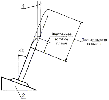 А.6.6 Разрешенное повторное испытаниеЕсли только один образец из пяти не будет соответствовать критериям, указанным в таблице А.1, другой комплект из пяти образцов подвергают тому же испытанию. Все образцы второго комплекта должны соответствовать критериям, указанным в таблице А.1. А.7 Испытание на возгораемость вспененных материалов для определения принадлежности к классам HF-1, HF-2 или HBFА.7.1 ОбразцыДесять образцов вспененных материалов для классификации по HF-1, HF-2 или HBF испытывают, как указано ниже. Образцы должны быть длиной около 150 мм, шириной 50 мм и наименьшей применяемой толщиной. Для пенопластового материала, обычно прикрепленного к поверхности из другого материала, допускается использовать образцы, состоящие из прикрепленного к поверхности пенопласта наименьшей толщины. А.7.2 Подготовка образцовПеред испытанием пять образцов, обозначаемых А, выдерживают в течение 7 сут (168 ч) в циркуляционной сушильной камере при постоянной температуре (70 ± 1) ºС. После этого, без выдержки времени, образцы помещают на 4 ч в сушильный шкаф с хлоридом кальция и охлаждают до температуры помещения. Пять других образцов, обозначаемых В, выдерживают в течение 48 ч при постоянной температуре (23 ± 2) °С и относительной влажности от 45 % до 55 %. А.7.3 Проведение испытанияОбразцы помещают на горизонтальную проволочную сетку (диаметр стальной проволоки 0,8 мм, размер ячейки 6,5 мм) длиной 200 мм, шириной 75 мм; с одной стороны сетка загнута вертикально на 13 мм. Сетку размещают на расстоянии 300 мм над слоем хирургической ваты. Для испытаний используют горелку Бунзена с веерообразным пламенем, трубка которой внутренним диаметром (9,5 ± 0,5) мм расположена на высоте над основными воздухозаборниками или технологическими отверстиями 100 мм, а распылитель пламени имеет ширину около 50 мм. Горелку помещают под изгибом проволочной сетки на 13 мм ниже так, чтобы пламя было параллельно изогнутой части и располагалось по его центру. Устройство крепления горелки должно обеспечивать возможность быстрого удаления и точного возврата ее на прежнее место. Теплоемкость газа должна быть около 37 МДж/м3. В отдалении от образца горелку зажигают и регулируют до получения ровного голубого пламени общей высотой около 38 мм. Один образец размещают горизонтально на сетке так, чтобы один его конец соприкасался с загнутой кверху частью сетки. Образцы из комбинированных материалов должны располагаться пенопластовой стороной вверх. Пламя горелки подводят под образец на 60 с и затем удаляют. Испытание повторяют на девяти других образцах. А.7.4 Критерии соответствияВо время и после испытания должны выполняться следующие условия: - не более чем один образец А и В может гореть дольше 2 с после удаления испытательного пламени; - ни один из образцов не должен гореть дольше 10 с после удалении пламени: - ни один из образцов не должен тлеть дольше 30 с после удаления пламени; - ни один из образцов не должен гореть или тлеть на расстоянии, больше 60 мм от края, к которому было приложено пламя. А.7.5 Критерии соответствия классу HF-2Материал относится к КЛАССУ HF-2, если он удовлетворяет требованиям А.7.4. Для КЛАССА HF-2 допускается воспламенение хирургической ваты. А.7.6 Критерии соответствия классу HF-1 Материал относится к КЛАССУ HF-1, если он удовлетворяет требованиям А.7.4, и, кроме того, частицы или капли, оторвавшиеся от об
