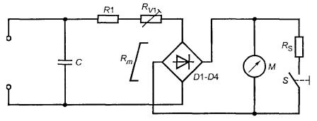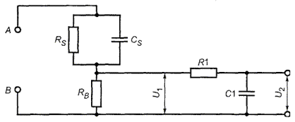 Рисунок С.1 - Определение среднеарифметической температуры С.2 ИзоляцияИзоляция в трансформаторах должна удовлетворять следующим требованиям. Обмотки и проводящие части трансформаторов должны рассматриваться как части цепей, к которым они подключены, если таковые имеются. Изоляция между ними должна удовлетворять требованиям 2.10 и выдержать соответствующие испытания по 5.2.2 согласно применению изоляции в оборудовании (см. 2.9.5). Необходимо учитывать возможность снижения ниже требуемой минимальной величины ЗАЗОРОВ и РАССТОЯНИЙ УТЕЧКИ, которые обеспечивают ОСНОВНУЮ ДОПОЛНИТЕЛЬНУЮ и УСИЛЕННУЮ ИЗОЛЯЦИИ при: - смещении обмоток или витков; - смещении внутренней проводки или проводов для внешних соединений; - чрезмерном смещении частей обмоток или внутренних проводов в случае разрыва проводов, близких к проводникам, или нарушении соединений; - шунтировании изоляции проводами, винтами, шайбами и т.п., которые могут быть утеряны и в результате отвинчивания свободно перемещаться. Считают, что два независимых крепления могут ослабнуть одновременно. Все обмотки должны иметь хорошо закрепленные концы. Соответствие проверяют осмотром, измерением и, если необходимо, следующими испытаниями. Если трансформатор снабжен заземленным экраном для целей защиты, он должен выдержать испытания но 2.6.3.3 между заземленным экраном и заземляющей клеммой трансформатора. Испытание на электрическую прочность между изоляцией любой обмотки и сердечником или экраном не проводят, если экран полностью закрыт или запрессован и отсутствует электрическое соединение с сердечником или экраном. Однако испытания проводят между обмотками, имеющими выводы. Примечание - Примерами приемлемых конструкций являются следующие (имеются и другие приемлемые формы): - обмотки, изолированные друг от друга размещением на отдельных частях сердечника, на шпулях или без шпуль; - обмотки на одном каркасе с разделяющими перегородками, где шпуля и перегородка штампуются отдельно либо прессуются единой конструкцией, или перегородка надевается на шпулю и т.д.; - концентрические обмотки на шпуле из изолирующего материала без бортовой кромки или на изоляции из тонкой листовой формы, надеваемой на сердечник трансформатора; - изоляция между обмотками в виде тонкой листовой изоляции, прокладываемой по верху намотки до конца витков каждого слоя; - концентрические обмотки, разделенные заземленным проводящим экраном из металлической фольги, занимающим всю ширину обмотки с соответствующей изоляцией между каждой обмоткой и экраном. Проводящий экран и его вывод имеют поперечное сечение, обеспечивающее замыкание тока при пробое изоляции и перегрузке прибора без разрушения последнего. Устройство защиты от перегрузки может быть частью трансформатора. ПРИЛОЖЕНИЕ D(обязательное) Прибор для измерения тока утечки на землю(см. 1.5.4) D.1 Измерительный приборИзмерительный прибор, приведенный на рисунке D.1, взят из МЭК 60990 [12], рисунок 4. А, В - клеммы; Rs = 1500 Ом; RB = 500 Ом; R1 = 10 кОм; СS = 0,22 мкФ; С1 = 0,022 мкФ Вольтметр или осциллограф, измеряющий пиковое или среднеквадратическое значение напряжения: входное сопротивление ... св. 1 МОм; входная емкость .…. не более 200 пФ; диапазон частот ……... 15 Гц - 1 МГц (о применении более высоких частот см. 1.4.7) Рисунок D.1 - Измерительный прибор Измерительный прибор калибруют на