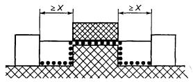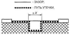Условие: рассматриваемый путь включает несплошной стык c канавками шириной X мм и более с каждой стороны. Правило: ЗАЗОР является отрезком прямой между частями. ПУТЬ УТЕЧКИ огибает контур канавок. Рисунок F.6 - Несплошной стык с широкими канавками Условие: рассматриваемый путь включает несплошной стык с канавкой с одной стороны, имеющей ширину менее X мм, и с канавкой с другой стороны, имеющей ширину X мм и более. Правило: ЗАЗОР и ПУТЬ УТЕЧКИ определяют как показано на рисунке F.7. Рисунок F.7 - Несплошной стык с узкой и широкой канавками
