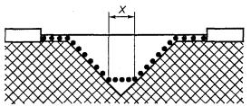 Условие: рассматриваемый путь включает канавку V-образной формы с углом менее 80° и шириной более X мм. Правило: ЗАЗОРОМ является отрезок прямой между частями. ПУТЬ УТЕЧКИ определяют по пути огибания контура канавки, но с «коротким замыканием» дна канавки на участке, равном X мм. Рисунок F.3 - V-образная канавка