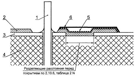 ДЛЯ УСТАНОВКИ ТОЛЬКО НА БЕТОНЕ Соответствие проверяют осмотром и, при необходимости, проведением испытаний по разделу А.5. Следующие конструкции удовлетворяют требованиям без испытаний: - без отверстий в основании ПРОТИВОПОЖАРНОГО КОЖУХА; - с отверстиями любого размера в основании под внутренней перегородкой, экраном или любой перегородкой, которая удовлетворяет требованиям, предъявляемым к ПРОТИВОПОЖАРНОМУ КОЖУХУ (см. также 4.2.1); - с отверстиями в основании, каждое из которых не более 40 мм2, расположенными под компонентами и частями, удовлетворяющими требованиям для МАТЕРИАЛОВ КЛАССА ВОЗГОРАЕМОСТИ V-1 или HF-1; - с отражающей пластиной, изображенной на рисунке 4F; - с металлическим основанием ПРОТИВОПОЖАРНОГО КОЖУХА с предельными размерами в соответствии с таблицей 4В; - с металлическим основанием в виде сетки, имеющей отверстия с расстояниями между центрами ячеек не более 2 мм и изготовленной из проволоки диаметром не менее 0,45 мм. 1 - отражающая пластина (может быть выше или ниже отверстий ПРОТИВОПОЖАРНОГО КОЖУХА); 2 - основание ПРОТИВОПОЖАРНОГО КОЖУХА Рисунок 4F - Конструкция отражающей пластины Таблица 4В - Размеры отверстий в металлических основаниях противопожарных кожухов Размеры в миллиметрах