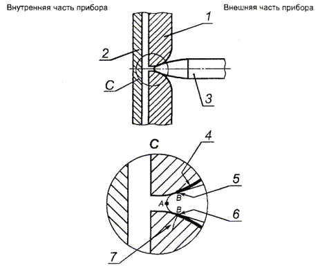 1 - игла; 2 - испытуемый образец Рисунок 2Н - Испытание покрывающего слоя на износостойкость Примечание - Игла находится в плоскости ABCD, перпендикулярной плоскости испытуемого образца 2.10.7 Закрытые корпусом и залитые составные частиДля компонентов или сборочных узлов, которые надежно покрыты или герметично защищены от пыли и влаги, степень загрязнения I применяют для внутренних ЗАЗОРОВ и ПУТЕЙ УТЕЧКИ. Примечание - В некоторых образцах части такой конструкции заключают в коробки, которые герметично заливают связующим материалом, и покрытые части помещают в оболочку. Соответствие проверяют обследованием с внешней стороны, измерением и, если необходимо, испытанием. Деталь или сборочный узел считают в достаточной мере закрытыми, если образец выдерживает следующую последовательность испытаний. Образец подвергают десятикратным испытаниям при следующей последовательности температурных циклов: 68 ч - при (Т1 ± 2) °С; 1 ч - при (25 ± 2) °С; 2 ч - при (0 ± 2) °С; не менее 1ч - при (25 ± 2) °С. Т1 = Т2 + Тмакс.окр - Токр + 10 °С (измеряют в соответствии с 1.4.5 или, где уместно, согласно 1.4.13), или Т1 = 85 ºС; выбирают наибольшее значение. Однако 10 °С не добавляют, если температура измерена с помощью встроенной термопары. Т2 - температура частей, измеренная во время испытаний в соответствии с 4.5.1. Значения Тмакс.окр и Токр даны в 1.4.12. Время перехода от одной температуры к другой не регламентируют; допускается постепенный переход. Образец после охлаждения до комнатной температуры подвергают в условиях влажности по 2.9.2 испытаниям на электрическую прочность в соответствии с 5.2.2. Для трансформаторов и аналогичных устройств, у которых изоляция обеспечивает безопасность, во время температурного цикла между обмотками подают напряжение среднеквадратического значения 500 В с частотой от 50 до 60 Гц. Во время испытания не допускается очевидное нарушение изоляции. 2.10.8 Объемы, заполненные изолирующим компаундомВ случаях, когда промежутки между токопроводящими частями эффективно заполнены изолирующим компаундом, включая и те, где изоляция надежно скреплена с изолирующим компаундом таким образом, что отсутствуют ЗАЗОРЫ и ПУТИ УТЕЧКИ, применяют требования только к расстоянию через изоляцию по 2.10.5.1. Примечания 1 Некоторые примеры такой обработки - заливка, вакуумная пропитка и герметизация. 2 Примером приемлемых форм конструкции могут служить: - компоненты или сборочные узлы, пропитанные изолирующим компаундом, заполняющим пустоты; - внутренняя изоляция многослойных печатных плат. Соответствие проверяют обследованием, измерением и испытаниями. Не производят измерения ЗАЗОРОВ и ПУТЕЙ УТЕЧКИ, если образцы прошли испытания на температурные циклы, влажность и электрическую прочность согласно 2.10.7. В этом случае применяют следующее: - для компонентов, где изолирующий компаунд образует сплошную изоляцию между проводящими частями, испытывают один законченный компонент. Испытания проводят последующим выполнением разрезов и измерением. Не должно быть ни трещин, ни пустот в изолирующем компаунде, которые могут повлиять на выполнение требований 2.10.5.1; - для компонентов, где изолирующий компаунд образует скрепляющий слой между изолирующими частями, электрическую прочность определяют на трех образцах, испытывая непосредственно скрепленные стыки. Если в компоненте используют обмот