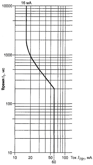 Рисунок М.3 - Амплитуда и размах амплитуд тока М.3.1.2 Напряжение Напряжение звонка должно быть менее 300 В двойной амплитуды и менее 200 В (амплитуда - земля), измеренное на сопротивлении не менее 1 МОм. М.3.1.3 Модуляция Напряжение звонка должно прерываться для создания пауз не менее 1 с, но не более 5 с. Во время пауз напряжение относительно земли не должно превышать 56,5 В постоянного напряжения. М.3.1.4 Ток в условиях единичного повреждения Если изменение вызывного сигнала является следствием единичного повреждения, то ток через резистор 5000 Ом, соединенный между любыми двумя выходными проводниками или между выходным проводником и землей, не должен превышать 56,5 мА двойной амплитуды, как показано на рисунке М.3. М.3.2 Устройство отключения и напряжение контроляМ.3.2.1 Условия применения устройства отключения или ограничения напряжения Цепь сигнала звонка должна включать в себя устройство отключения в соответствии с М.3.2.2 или обеспечить ограничение напряжения согласно М.3.2.3, или оба метода одновременно в зависимости от тока, протекающего через указанное сопротивление. Устройство подключают между источником сигнала звонка и землей и применяют в следующих случаях: - если ток через резистор 500 Ом не превышает 100 мА двойной амплитуды, то не требуются ни устройство отключения, ни ограничения напряжения; - если ток через резистор 1500 Ом превышает 100 мА двойной амплитуды, то требуется устройство отключения. Если устройство отключения удовлетворяет требованиям рисунка М.4 для R = 500 Ом, то не требуется устройства ограничения напряжения. Если, однако, устройство отключения удовлетворяет требованиям рисунка М.4 с R = 1500 Ом, то необходимо применять устройство ограничения напряжения; - если ток через резистор 500 Ом превышает 100 мА двойной амплитуды, но ток через резистор 1500 Ом не превышает этого значения, то необходимо применить устройство отключения, соответствующее требованиям рисунка М.4 для R = 500 Ом, или необходимо применить устройство ограничения напряжения. Примечания 1 Время t измеряют от момента подключения сопротивления R к цепи. 2 Наклонную часть графика определяют как Рисунок М.4 - Пределы ограничения напряжения звонка М.3.2.2 Устройство отключения Устройство отключения включается последовательно и при определенной величине тока отключает звонок, как показано на рисунке М.4. Напряжение в цепи звонка относительно земли должно находится от 19 В (амплитудного значения) до 56,5 В (постоянного напряжения) в любой момент, когда звонок отсутствует. ПРИЛОЖЕНИЕ N(обязательное) Испытательный импульсный генераторСхема, приведенная на рисунке N.1, применяется для генерации импульсов. Значения компонентов, используемых в схеме, приведены в таблице N.1. Конденсатор С1 первоначально заряжается до напряжения Uс. Испытательные импульсы 10/700 мкс (где 10 мкс - время нарастания переднего фронта импульса, 700 мкс - длительность импульса по уровню 0,5), генерируемые схемой, соответствуют импульсам, установленным ITU-T, Рекомендация К.17 [17], для моделирования помех от грозовых разрядов в ТЕЛЕКОММУНИКАЦИОННОЙ СЕТИ. Испытательные импульсы 1,2/50 мкс (1,2 мкс - время нарастания переднего фронта импульса, 50 мкс - длительность импульса по уровню 0,5), генерируемые схемой, соответствуют импульсам, установленным ITU-T, Рекомендация К.21 [18], для моделирования переходных процессов в распределительных с