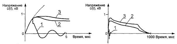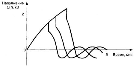 Последовательные импульсы не повторяются по форме. Форма каждого импульса изменяется вследствие пробоя изоляции. Пробой четко виден на осциллограмме импульсного напряжения. Рисунок S.2 - Форма сигналов при
