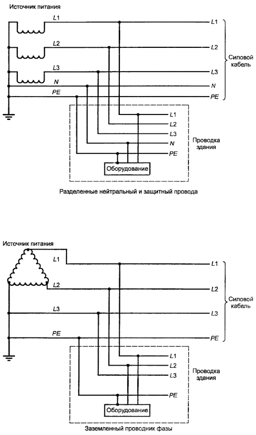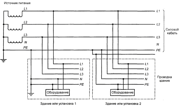 U.2.4 Сохранение электрической прочности после изгибаПять образцов подготавливают, как указано в U.2.2, и проверяют следующим образом. Из каждого образца удаляют оправку и помещают в контейнер так, чтобы он был погружен, по крайней мере на 5 мм в металлическую дробь. Концы проводника должны быть достаточно длинными, чтобы избежать перекрытия. Дробь должна быть изготовлена диаметром не более 2 мм из нержавеющей стали, никеля или железа, покрытого никелем. Дробь осторожно засыпают в контейнер, пока образец не будет покрыт слоем толщиной не менее 5 мм. Дробь периодически должна очищаться подходящим для этого растворителем (например 1,1,1 - трихлорэтаном). Примечание- Вышеупомянутая процедура изложена в 4.6.1с ГОСТ Р МЭК 60851-5. Испытательное напряжение, равное не менее чем приведенному в таблице 5В (см. 5.2.2) или 3000 В действующего значения, (выбирают независимо от того, какое значение больше), подают между дробью и проводом. Диаметр оправки и усилие, с которым провод наматывают на оправку, - согласно U.2.2. U.3 Испытание в процессе производстваПровод в процессе производства должен подвергаться изготовителем испытанию на электрическую прочность, как определено в U.3.1 и U.3.2. U.3.1 Периодическое испытаниеИспытательное напряжение при ПЕРИОДИЧЕСКИХ ИСПЫТАНИЯХ должно выбираться из таблицы 5В (см. 5.2.2), но быть не менее 3 кВ действующего значения, или 4.2 кВ пикового значения. U.3.2 Испытания образцовОбразцы витой пары должны быть проверены в согласно с ГОСТ Р МЭК 60851-5, 4.4.1. Минимальное напряжение пробоя должно составлять удвоенное значение соответствующего напряжения из таблицы 5В (см. 5.2.2), но не менее чем 6 кВ действующего значения или 8,4 кВ пикового значения. ПРИЛОЖЕНИЕ V(обязательное) Системы распределения электрической энергии(см. 1.6.1) V.1 ВведениеСогласно ГОСТ 30331.2/ГОСТ 50571.2, системы распределения энергии переменного тока классифицируют как TN, ТТ и IT, в зависимости от расположения токоведущих проводников и метода заземления. Классы и коды пояснены в настоящем приложении. Некоторые примеры каждого класса приведены на рисунках; возможны иные конфигурации. На рисунках: - в большинстве случаев, электрические системы питают одно- и трехфазное оборудование, но для простоты, приведены примеры однофазного оборудования; - источники питания могут содержать вторичные трансформаторы, управляемые мотор генераторы или системы бесперебойного питания; - для трансформаторов в пределах одного здания, некоторые рисунки применимы, и при этом здание ограничено его полом; - некоторые электрические системы заземляют в дополнительных точках, например, во входных точках электрических вводов зданий пользователей (см. ГОСТ 30331.2/ГОСТ 50571.2). Рассматриваются следующие типы подключения оборудования (в число проводов не включают проводники, используемые исключительно для заземления): - однофазный двухпроводный; - однофазный трехпроводный; - двухфазный трехпроводный; - трехфазный трехпроводный; - трехфазный четырехпроводный. Системные используемые коды имеют следующие значения. Первая буква (отношение электрической системы к земле) означает: Т - прямое подключение одного полюса к земле; I - систему, изолированную от земли или в одной точке, соединенной с землей через импеданс. Вторая буква (заземление оборудования) означает: Т - прямое подключение оборудования к земле, независимо от зазе