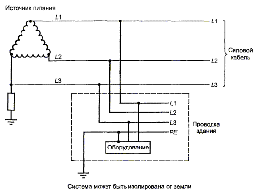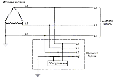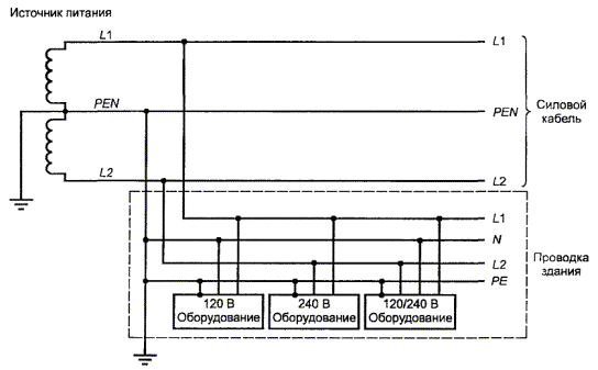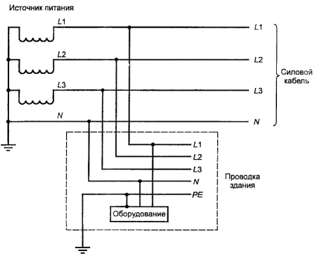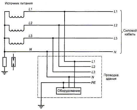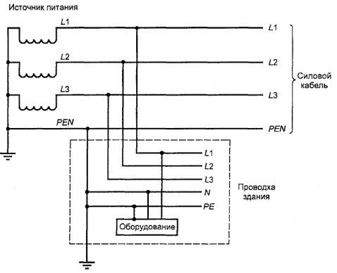 Один провод объединяет в себе функции нейтрального и защитного провода Рисунок V.3 - Пример TN-C системы энергопитания