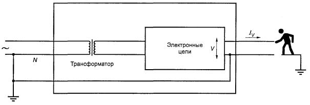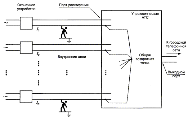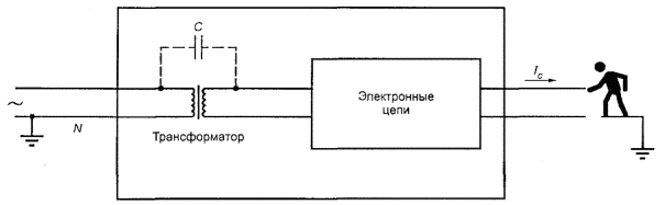 Рисунок V.8 - Пример трехфазной IT системы энергопитания ПРИЛОЖЕНИЕ W(справочное) Суммирование токов прикосновенияПриложение поясняет требования и испытания, приведенные в 5.1.8.2. W.1 Токи прикосновения от электронных цепейИмеются два совершенно различных механизма, которые определяют величину электрического тока, проходящего через тело человека, касающегося электрической цепи (или электрической магистрали), в зависимости от того, является ли цепь заземленной. Это разделение между заземленными и незаземленными (с изменяющимися параметрами) цепями не такое, как между ОБОРУДОВАНИЕМ КЛАССА I и ОБОРУДОВАНИЕМ КЛАССА II. Цепи с измененными параметрами могут существовать в ОБОРУДОВАНИИ КЛАССА I, а заземленные цепи - в ОБОРУДОВАНИИ КЛАССА II. Цепи с измененными параметрами обычно, но не только, используют в оборудовании передачи данных и заземленных цепях аппаратуры обработки данных. Чтобы рассмотреть самый худший случай, приведенный в настоящем приложении, будем считать, что ТЕЛЕКОММУНИКАЦИОННЫЕ СЕТИ не подсоединены и проводники ПИТАНИЯ ОТ СЕТИ ПЕРЕМЕННОГО ТОКА и люди как тела (ОБСЛУЖИВАЮЩИЙ ПЕРСОНАЛ или ОПЕРАТОРЫ) заземлены. Необходимо отметить, что ОБСЛУЖИВАЮЩИЙ ПЕРСОНАЛ может касаться частей, которые НЕ ДОСТУПНЫ ДЛЯ ОПЕРАТОРА. «Заземленная» цепь означает, что она или непосредственно заземлена, или некоторым способом, подключена к земле так, что ее потенциал относительно земли установлен. W1.1 Цепи с изменяющимися параметрамиЕсли цепь не заземлена, то ток IC - через тело человека протекает вследствие «утечки» через паразитную или собственную емкость С и через изоляцию в сетевом трансформаторе (см. рисунок W.1). Рисунок W.1 - Прикосновение к изменяющейся цепи Ток IС характеризуется относительно высоким напряжением, высоким импедансом источника, и его значение в значительной степени не зависит от рабочего напряжения электронной цепи. В настоящем стандарте ток IС через тело человека ограничивают, применяя при испытании измерительный прибор из приложения D, который грубо моделирует тело человека. W.1.2 Заземленные цепиЕсли электронная цепь заземлена, ток через тело человека Iv зависит от рабочего напряжения U в цепи, являющегося источником более низкого импеданса по сравнению с телом (см. рисунок W.2). Любой ток утечки от сетевого трансформатора (см. W.1.1) будет уходить на землю и не будет проходить через тело человека. Рисунок W.2 - Ток прикосновения от заземленной цепи В настоящем стандарте ток через тело человека Iv ограничивают, определяя максимальные значения напряжения для доступной цепи, которая должна быть БСНН ЦЕПЬЮ или (с ограниченной достижимостью) НТС ЦЕПЬЮ. W.2 Соединение нескольких единиц оборудованияЭто характерная специфика оборудования информационной технологии, особенно в целях передачи данных, когда много единиц оборудования могут быть соединены с центральным оборудованием в «звезду». Пример - телефонные расширители или оконечные устройства ввода данных, соединенные с УЧРЕЖДЕНЧЕСКОЙ АТС, которая может иметь десятки или сотни портов. Этот пример используется в следующем описании (см. рисунок W.3). Каждое оконечное устройство может быть источником тока для человека, касающегося цепи соединения (I1, I2,….., Iп), суммируемым с током, от портов УЧРЕЖДЕНЧЕСКОЙ АТС. Если несколько цепей соединены в общей точке, их индивидуальные 