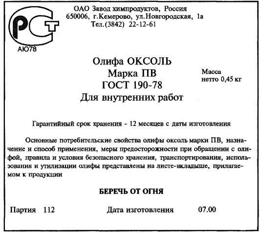 Рисунок В.1 - Маркировка, наносимая на этикетку ОСНОВНЫЕ ПОТРЕБИТЕЛЬСКИЕ СВОЙСТВА, НАЗНАЧЕНИЕ И СПОСОБ ПРИМЕНЕНИЯ, МЕРЫ ПРЕДОСТОРОЖНОСТИ ПРИ ОБРАЩЕНИИ С ОЛИФОЙ, ПРАВИЛА И УСЛОВИЯ БЕЗОПАСНОГО ХРАНЕНИЯ, ТРАНСПОРТИРОВАНИЯ, ИСПОЛЬЗОВАНИЯ И УТИЛИЗАЦИИ ОЛИФЫ ОКСОЛЬ Олифа оксоль предназначается для разведения масляных густых красок, для пропитки (олифовки) деревянных поверхностей, штукатурки перед окраской их масляными красками. Олифа оксоль марки ПВ и краски, приготовленные с ее применением, - для работ внутри помещений (кроме окраски полов). Олифа оксоль наносится кистью на чистую сухую поверхность. Сушка каждого слоя при температуре (20 ± 2) °С - 24 ч. Олифу следует переносить, транспортировать и хранить в плотно закрытой таре. Помещение, где проводится окраска, должно проветриваться. Не допускается оставлять в помещении тряпки, ветошь, пропитанные олифой. Олифу в упакованном виде хранят в закрытом помещении при температуре окружающей среды от минус 40 °С до плюс 40 °С вдали от отопительных и нагревательных приборов. После использования олифы по назначению бутылки (банки) из-под олифы, с остатками продукта должны быть плотно закрыты и отправлены на бытовую свалку. Перед удалением на бытовую свалку тара должна быть плотно закрыта укупорочными средствами.