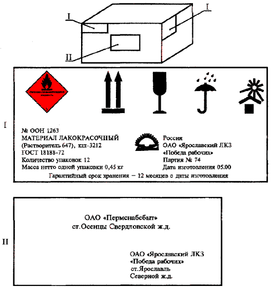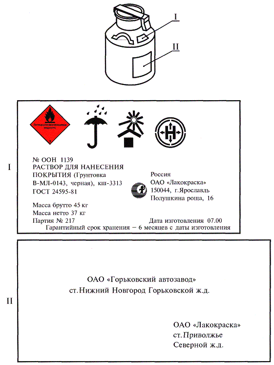 I - совмещенная маркировка (транспортная маркировка и маркировка, характеризующая продукцию); II - транспортная маркировка (основные и дополнительные надписи) Рисунок Г.1 ПРИЛОЖЕНИЕ Д(рекомендуемое) Маркировка, наносимая на транспортную тару (флягу)