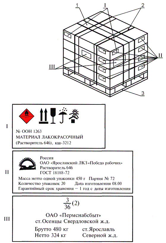 I, III - транспортная маркировка, наносимая на пакет; II - маркировка, характеризующая продукцию и наносимая на ящик; 1 - ящик; 2 - лента; 3 - поддон Рисунок Е.1 ПРИЛОЖЕНИЕ Ж(рекомендуемое) Нанесение маркировки на транспортный пакет, сформированный из барабанов