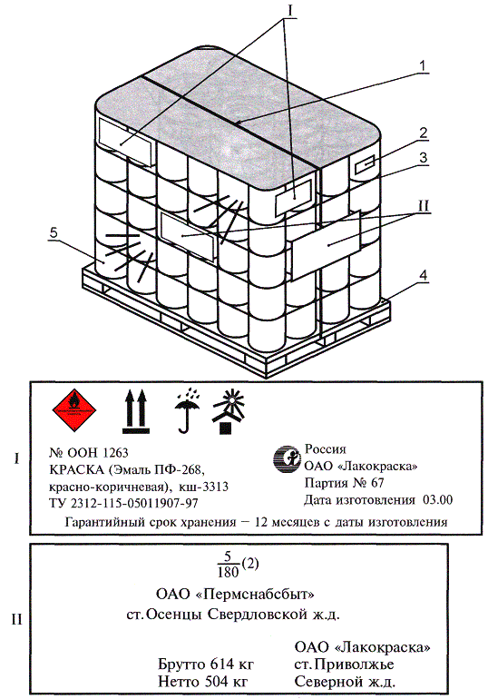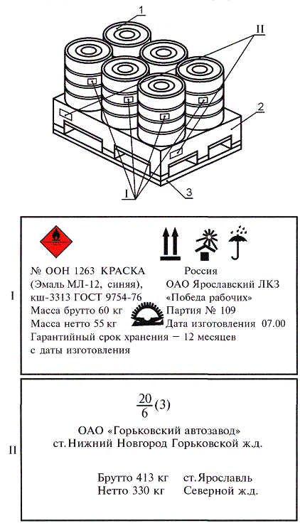 I - транспортная маркировка (манипуляционные знаки, знак опасности) и маркировка, характеризующая продукцию; II - транспортная маркировка (основные и дополнительные надписи); 1 - барабан; 2 - металлическая рама; 3 - поддон Рисунок Ж.1 ПРИЛОЖЕНИЕ И(рекомендуемое) Нанесение маркировки на транспортный пакет, сформированный из металлических банок