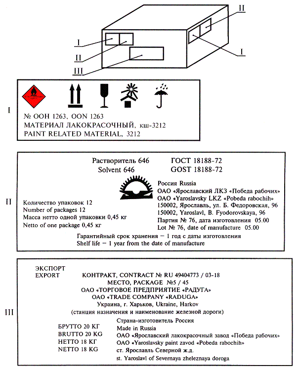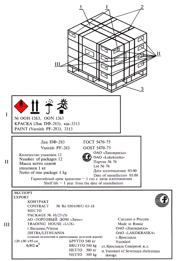 в скобках порядковый номер пакета, например: 10) полное или условное зарегистрированное в установленном порядке наименование грузоотправителя, 11) наименование пункта отправления с указанием железнодорожной станции отправления и сокращенное наименование дороги отправления, 12) надписи транспортных организаций (в соответствии с правилами перевозок грузов на соответствующем виде транспорта), 13) количество единиц тары в штуках; г) характеризующие дополнительную маркировку продукции: 1) рекламная информация, характеризующая особые свойства или преимущества данного материала по сравнению с аналогами (устанавливается изготовителем или продавцом), 2) дополнительные знаки, зарегистрированные и утвержденные в установленном порядке, 3) международная уникальная идентификация транспортируемых единиц в виде символа штрихового кода (для транспортируемых единиц) (при наличии); д) характеризующие продукцию, поставляемую на экспорт: 1) номер контракта и (или) заказа иностранного покупателя, 2) номер грузового места - указывается дробью: в числителе - порядковый номер места в партии; в знаменателе - количество мест в партии, 3) полное наименование или условное обозначение иностранного грузополучателя, 4) наименование пункта назначения с указанием станции или порта перегрузки (при транспортировании железнодорожным и водным видами транспорта) в полном соответствии с нормативными документами на материалы, 5) страна назначения груза, 6) станция и дорога назначения груза (при транспортировании железнодорожным транспортом), 7) товарные знаки и марки грузоотправителя, 8) наименование экспортирующей организации (фирмы, предприятия) - полное или условное, 9) пункт отправления груза, 10) станция и дорога отправления (при транспортировании железнодорожным транспортом), 11) габаритные размеры грузового места в сантиметрах, 12) массы брутто и нетто в килограммах, 13) объем грузового места в кубических метрах, 14) надписи «Экспорт», «Страна-изготовитель и (или) поставщик», 15) дополнительные требования контракта в части маркировки продукции. 4.1.2 Маркировочные данные двухкомпонентных лакокрасочных материалов, предназначенных для розничной торговли, указывают в НД или ТД на продукцию. 4.1.3 На крышке или кольце банки с лакокрасочным материалом, предназначенным для розничной торговли, должна быть помещена выкраска пигментированного материала. Форму и размер выкраски устанавливает изготовитель. 4.1.4 Необходимость нанесения на транспортную тару манипуляционных знаков «Ограничение температуры» и «Предел по количеству ярусов в штабеле» указывают в НД или ТД на продукцию. 4.1.5 Допускается не наносить знак опасности, номер ООН и классификационный шифр на деревянные, металлические, картонные и полимерные ящики массой брутто не более 30 кг при поставке лакокрасочной продукции в торговую сеть водным и автомобильным транспортом при соблюдении следующих условий: - для грузов со степенью опасности 3 по ГОСТ 19433 вместимость потребительской тары не должна превышать 5 дм3; - для грузов со степенью опасности 2 по ГОСТ 19433 вместимость металлической тары не должна превышать 1 дм3, а стеклянной и полимерной тары - 0,5 дм3. 4.1.6 Основные и дополнительные надписи (4.1.1, перечисление в) 6 - 11) допускается наносить не на все, а не менее чем на четыре грузовые места при перевозке грузов в прямо