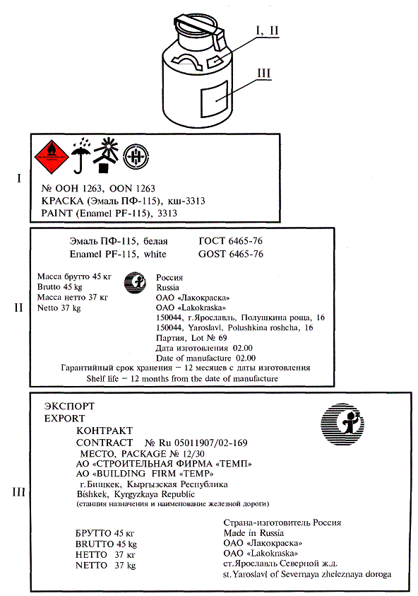 3 Настоящий стандарт содержит требования Рекомендаций экспертов ООН по перевозке опасных грузов (Глава 3.2. Перечень опасных грузов. Глава 5.2. Маркировка и знаки опасности); Европейского соглашения о международной дорожной перевозке опасных грузов (ДОПОГ) (Приложение А. Часть II. Перечень веществ и особые предписания, касающиеся различных классов, включая класс 3. Легковоспламеняющиеся жидкости. Добавление В.5. Перечень веществ и идентификации номеров), изложенные в приложении Б (таблица Б.1) 4 Постановлением Государственного комитета Российской Федерации по стандартизации и метрологии от 24 декабря 2002 г. № 500-ст межгосударственный стандарт ГОСТ 9980.4-2002 введен в действие непосредственно в качестве государственного стандарта Российской Федерации с 1 сентября 2003 г. 5 ВЗАМЕН ГОСТ 9980.4-86 СОДЕРЖАНИЕ МЕЖГОСУДАРСТВЕННЫЙ СТАНДАРТ МАТЕРИАЛЫ ЛАКОКРАСОЧНЫЕ Маркировка Paint materials. Marking Дата введения 2003-09-01 1 Область примененияНастоящий стандарт устанавливает требования к маркировке лакокрасочных материалов, изготовленных для нужд народного хозяйства и экспорта. 2 Нормативные ссылкиВ настоящем стандарте использованы ссылки на следующие стандарты: ГОСТ 12.1.007-76 Система стандартов безопасности труда. Вредные вещества. Классификация и общие требования безопасности ГОСТ 190-78 Олифа оксоль. Технические условия ГОСТ 5470-75 Лаки марок ПФ-283 и ГФ-166. Технические условия ГОСТ 6034-74 Декстрины. Технические условия ГОСТ 6465-76 Эмали ПФ-115. Технические условия ГОСТ 8420-74 Материалы лакокрасочные. Методы определения условной вязкости ГОСТ 9754-76 Эмали МЛ-12. Технические условия ГОСТ 9980.3-86 Материалы лакокрасочные. Упаковка ГОСТ 13078-81 Стекло натриевое жидкое. Технические условия ГОСТ 14192-96 Маркировка грузов ГОСТ 17527-86 Упаковка. Термины и определения ГОСТ 18188-72 Растворители марок 645, 646, 647, 648 для лакокрасочных материалов. Технические условия ГОСТ 18992-80 Дисперсия поливинилацетатная гомополимерная грубодисперсная. Технические условия ГОСТ 19433-88 Грузы опасные. Классификация и маркировка ГОСТ 20231-83 Контейнеры грузовые. Термины и определения ГОСТ 20477-86 Лента полиэтиленовая с липким слоем. Технические условия ГОСТ 21391-84 Средства пакетирования. Термины и определения ГОСТ 24595-81 Грунтовка В-МЛ-0143. Технические условия 3 ОпределенияВ настоящем стандарте применяют термины по ГОСТ 17527, ГОСТ 19433, ГОСТ 20231, ГОСТ 21391, а также следующие термины с соответствующими определениями: 3.1 потребитель: Гражданин или субъект хозяйственной деятельности, имеющий намерение заказать или приобрести либо заказывающий или приобретающий продукцию (конкретные непродовольственные товары) для собственного использования. 3.2 покупатель: Юридическое или физическое лицо, использующее, приобретающее или заказывающее либо имеющее намерение приобрести или заказать товары и услуги. 3.3 изготовитель: Отечественный или зарубежный субъект хозяйственной деятельности любой формы собственности, производящий конкретные непродовольственные товары для их реализации в своей стране гражданам или другим субъектам хозяйственной деятельности. 3.4 продавец: Организация или индивидуальный предприниматель, реализующий товары и оказывающий услуги покупателю по договору купли-продажи. 3.5 товарный знак: Обозначение, позволяющее отличать товар одних изготовителей от аналогичных по виду и назначению товаров других отечественн