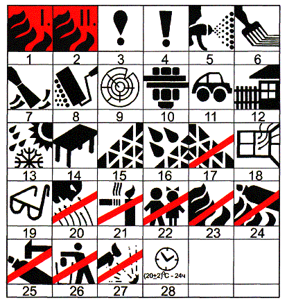 1 - горючая жидкость 1-го класса опасности по ГОСТ 12.1.007; 2 - горючая жидкость 2-го класса опасности по ГОСТ 12.1.007; 3 - первая помощь; 4 - предупреждение; 5 - нанесение распылителем; 6 - нанесение кистью; 7 - нанесение шпателем; 8 - нанесение валиком; 9 - для древесины; 10 - для металла; 11 - для кузовов; 12 - для наружных работ; 13 - атмосферостойкий; 14 - для внутренних работ; 15 - шлифовка; 16 - мокрая шлифовка; 17 - шлифовка воспрещается; 18 - обеспечить достаточную вентиляцию; 19 - применять средства защиты; 20 - опасные испарения; 21 - не применять открытое пламя, не курить; 22 - беречь от детей; 23 - сжигание воспрещается; 24 - аэрозольный баллон не бросать в огонь; 25 - аэрозольный баллон не разбивать и не опрокидывать; 26 - отходы и пустую тару удалять безопасным способом; 27 - пожаро- и взрывоопасность при контакте с открытым пламенем; 28 - время высыхания (24 ч) Рисунок М.1 Ключевые слова: материалы лакокрасочные, маркировка, информация для потребителя, тара потребительская, тара транспортная, этикетка, срок хранения, срок годности, товарный знак, знак соответствия, штриховой код, символика, пиктограммы, назначение и способ применения |
