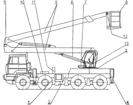 1 - базовое шасси; 2 - опорная рама; 3 - поворотная рама; 4 - выносные опоры; 5 - стрела (комбинированная); 6 - механизм подъема; 7 - механизм поворота; 8 - рабочая платформа; 9 - следящая система; 10 - гидрооборудование; 11 - электрооборудование; 12 - устройства (приборы) безопасности; 13 - кабина машиниста Рисунок А.1 - Стреловой самоходный подъемник с комбинированной стрелой
