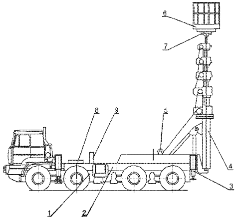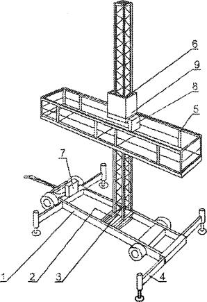 1 - базовое шасси; 2 - опорная рама; 3 - выносные опоры; 4 - стрела вертикального телескопирования; 5 - механизм подъема; 6 - рабочая платформа; 7 - устройства (приборы) безопасности; 8 - гидрооборудование; 9 - электрооборудование Рисунок А.2 - Стреловой самоходный подъемник со стрелой вертикального телескопирования