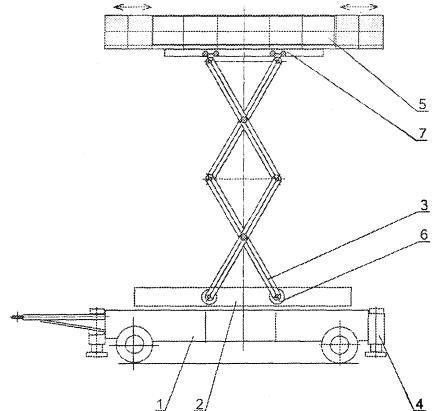 1 - базовое шасси; 2 - опорная рама; 3 - стрела пантографного типа; 4 - выносные опоры; 5 - рабочая платформа; 6 - механизм подъема; 7 - устройства (приборы) безопасности Рисунок А.3 - Стреловой прицепной подъемник со стрелой пантографного типа с раздвижной рабочей платформой