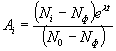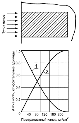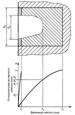 Рисунок К.1 Вводят следующие характеристики локального разрушения: Sя/S0 - доля разрушенной площади и хя - средняя глубина язв. Вводят два параметра, для чего создают в метке два радионуклида, различным и известным образом распределенных по глубине l1 и l2 соответственно. Предполагая, что один из радионуклидов наведен в очень тонком слое и любое локальное повреждение приводит на своем участке к полному его уносу, находят указанные характеристики разрушения из системы уравнений: