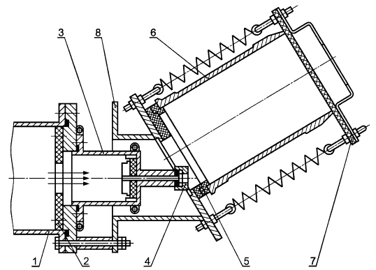 a - вертикальный вариант; б - горизонтальный вариант; 1 - конец ионопровода; 2 - стол; 3 - подставка; 4 - электродвигатель; 5 - облучаемая стопка поршневых колец Рисунок Б.1 - Устройство для активации поршневых колец 1, 2, 3, 5 - фланцы; 4 - трубка; 6 - шпильки; 7 - уплотнения гильзы; 8 - направляющие Рисунок Б.2 - Устройство для активации гильз цилиндра двигателей внутреннего сгорания ПРИЛОЖЕНИЕ В(рекомендуемое) Рекомендации по выбору режимов облучения основных химических элементов и конструкционных материалов, изготовленных на их основеТаблица В.1