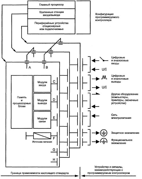 4.3.5 Другие условия Пользователь должен согласовать с изготовителем любые механические условия испытаний, не указанные в настоящем стандарте. 4.3.6 Информация, представляемая изготовителем Изготовитель должен представлять инструкции по транспортированию и хранению. 4.4 Условия транспортирования и хранения конфигураций ПК, включенных в законченные системы управленияНе рассматриваются настоящим стандартом, и по этим вопросам следует получить консультацию изготовителя. 5 Электрические требования5.1 Общие положенияТиповая конфигурация системы с ПК и ее интерфейсы представлены на рисунке 1. 5.2 Источники питания постоянного и переменного тока5.2.1 Первичное электропитание 5.2.1.1 Номинальные величины и рабочие диапазоны. Первичное электропитание конфигурации ПК и модулей ввода/вывода, получающих энергию от внешних источников, должно иметь характеристики, представленные в таблице 7, и соответствовать ГОСТ 29322. А - интерфейс для удаленных станций ввода/вывода; В - интерфейс для периферийных устройств; С - интерфейс для цифровых и аналоговых входных сигналов; D - интерфейс для цифровых и аналоговых выходных сигналов; Е - последовательные или параллельные интерфейсы передачи данных другому оборудованию; F - интерфейс источников электропитания; G - интерфейс защитного заземления; Н - интерфейс функционального заземления Рисунок 1 - Типовая конфигурация ПК Таблица 7 - Номинальные значения и рабочие диапазоны первичного электропитания