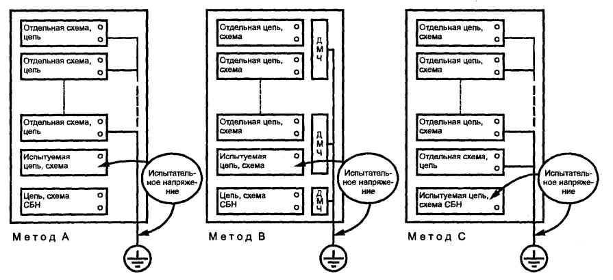 8.3.6 Электрические испытания ВНИМАНИЕ! Возможно потребуется установка внешнего фильтра для защиты испытательного оборудования, подсоединяемого к испытуемой базовой конфигурации ПК. 8.3.6.1 Испытания, относящиеся к безопасности 8.3.6.1.1 Диэлектрическое испытание Исключения Испытания не требуется проводить: - между изолированными цепями со сверхнизким безопасным напряжением и доступными проводящими частями (рамы, корпуса, зажимы заземления и т.д.); - на блоках (частях базовой конфигурации ПК), которые были проверены раздельно по соответствующим стандартам, при условии, что: а) значения, приведенные в таблице 17, были соблюдены, б) электрическая прочность диэлектрика не ослаблена сборкой; - между изолированными цепями на платах печатного монтажа при условии, что регламентированные зазоры и пути утечек были соблюдены. См. 6.3. Условия испытаний Испытания проводят на каждом блоке и модуле, включенных в испытательную схему, как показано на рисунке 8. Если требуется, испытания могут проводиться на индивидуальных модулях при удаленных остальных модулях. Все механические выключатели должны быть установлены в положение «ВКЛ». Методы испытаний Можно применять любой из следующих методов. Импульсное испытание при следующих условиях: параметры импульса....................................................... 1,2/50 мкс ± 20 % полное сопротивление источника питания................. 500 Ом ± 10 % мощность источника питания........................................ 0,5 Дж ± 20 % длина подключения........................................................ менее 2 м число импульсов............................................................. три положительных и три отрицательных время между двумя импульсами.................................... свыше 5 с Испытание действующим напряжением переменного тока при следующих условиях: число периодов............................................................... свыше 3 начальное напряжение................................................... от 0 В ток короткого замыкания................................................ менее 5 мА Испытание напряжением постоянного тока при следующих условиях: импульсная длительность величины постоянного тока... 10 мс ± 20 % время нарастания/спада импульса...................................... свыше 1,2 мкс число импульсов................................................................... по одному положительному и отрицательному время между импульсами.................................................... менее 5 с ток короткого замыкания..................................................... менее 5 мА Примечания 1 Предпочтительно импульсное испытание; однако в случае применения фильтрующих конденсаторов (связь с заземлением) рекомендуется испытание напряжением постоянного тока. 2 См. приложение Г - поправочные коэффициенты для испытательных напряжений. 3 В соответствии с признанной практикой изготовитель может выбирать альтернативную проверку электрической прочности диэлектрика путем приложения напряжения 2Ue + 1000 В переменного тока минимальной продолжительностью 1 мин. Метод А - последовательное испытание каждой отдельной цепи, схемы СБН; метод В - испытание между каждой доступной металлической частью оборудования и цепью, схемой, не относящихся к СБН; метод С - испытание между каждой цепью, схемой СБН и цепями, схемами, не относящимися к СБН; ДМЧ - доступные металлические части оборудования Рисунок 8 - Схема диэлектрических испытаний Метод испытаний Испытательное напряжение должно прикладываться следующим образом: а) между изолированными цепями, кроме цепей со сверхнизки